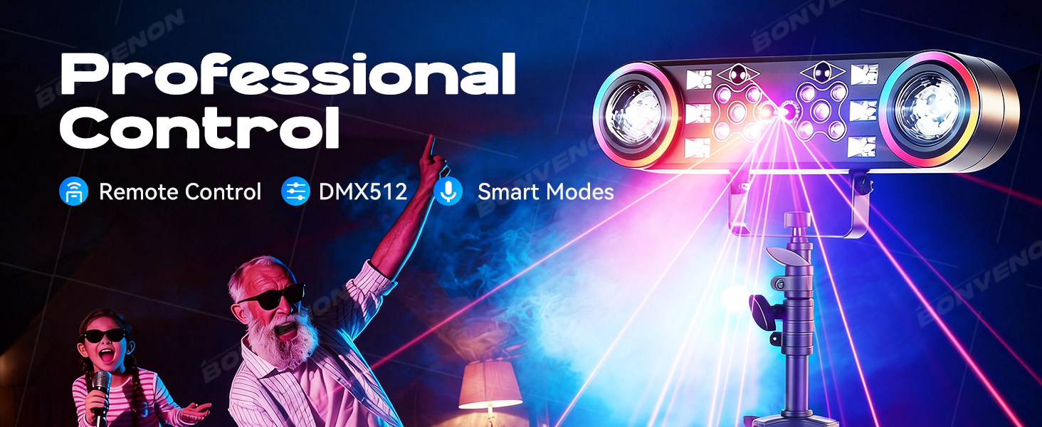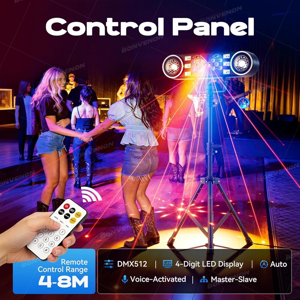 التحكم الكامل في طريقك: تولى الأمر باستخدام 5 أوضاع مرنة: الصوت النشط، التلقائي، الرئيسي/التابع، DMX، وجهاز التحكم عن بعد اللاسلكي (29 قناة، نطاق 25 قدمًا). استخدم كابلات XLR ذات 3 سنون المرفقة لسلسلة ديزي DMX512 الاحترافية أو انطلق بدون كابلات.