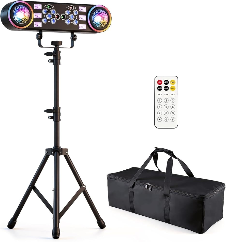 أضواء دي جي مع حامل، 7 في 1 أضواء حفلات دي جي ديسكو تعمل بالصوت وجهاز تحكم عن بعد DMX مع كرة دوارة، ستروب، الأشعة فوق البنفسجية، تأثير ملون لفرقة KTV لحفلات الزفاف مع حقيبة حمل