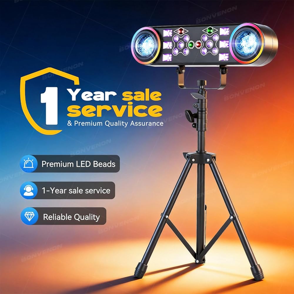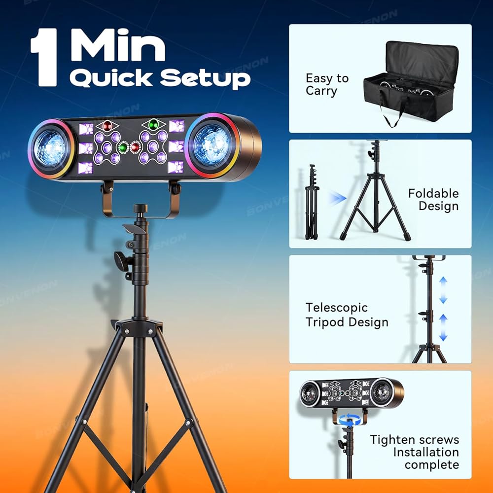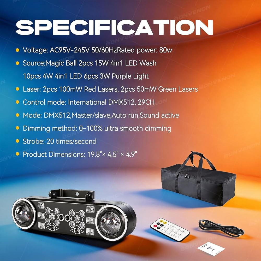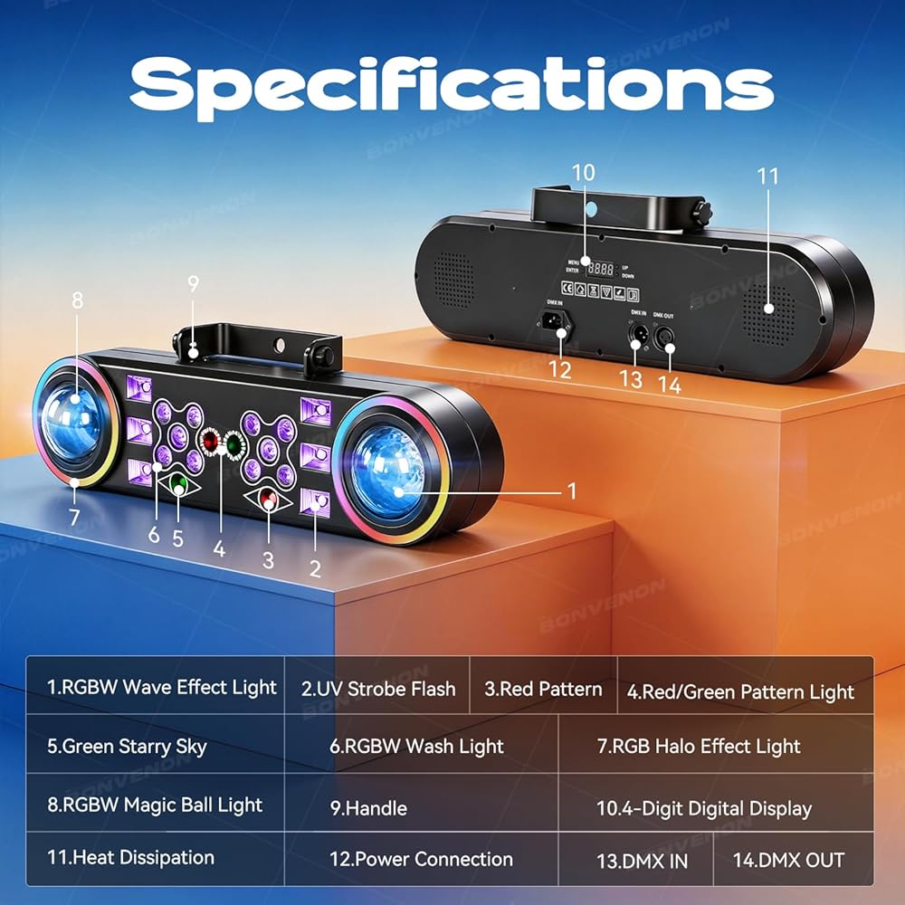 أداء قوي 80 وات: تم تصميمه للتأثير، يتميز مصباح LED الساطع بقدرة 80 وات هذا بمصباح الأشعة فوق البنفسجية، ومزج الألوان بسلاسة، وسرعة قابلة للتعديل. يتميز بشاشة LED واضحة، وإدخال جهد عريض (AC100-240V للاستخدام في الولايات المتحدة الأمريكية وفي جميع أنحاء العالم)، وتشغيل موثوق به في بيئات مختلفة.