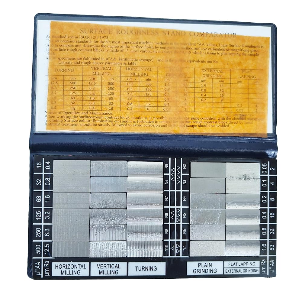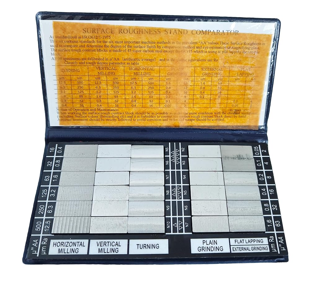 ● and contains:3 Specimen Flat Grinding - 2, 4, and 8μ“ AA 3 Specimen Reaming - 16, 32, and 63μ” AA 6 Specimen Grinding - 2, 4, 8, 16, 32, and 63μ“ AA 6 Specimen Horizontal Milling - 16 , 32, 32, 63, 125, 250, and 500μ” AA 6 Specimen Vertical Milling - 16, 32, 63, 125, 250 and 500μ“ AA 6 Specimen Turning - 16, 32, 63, 125, 250 and 500μ” AA Specifications meet S.A.E.
