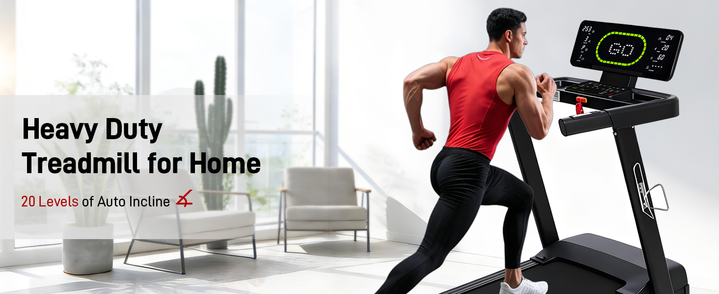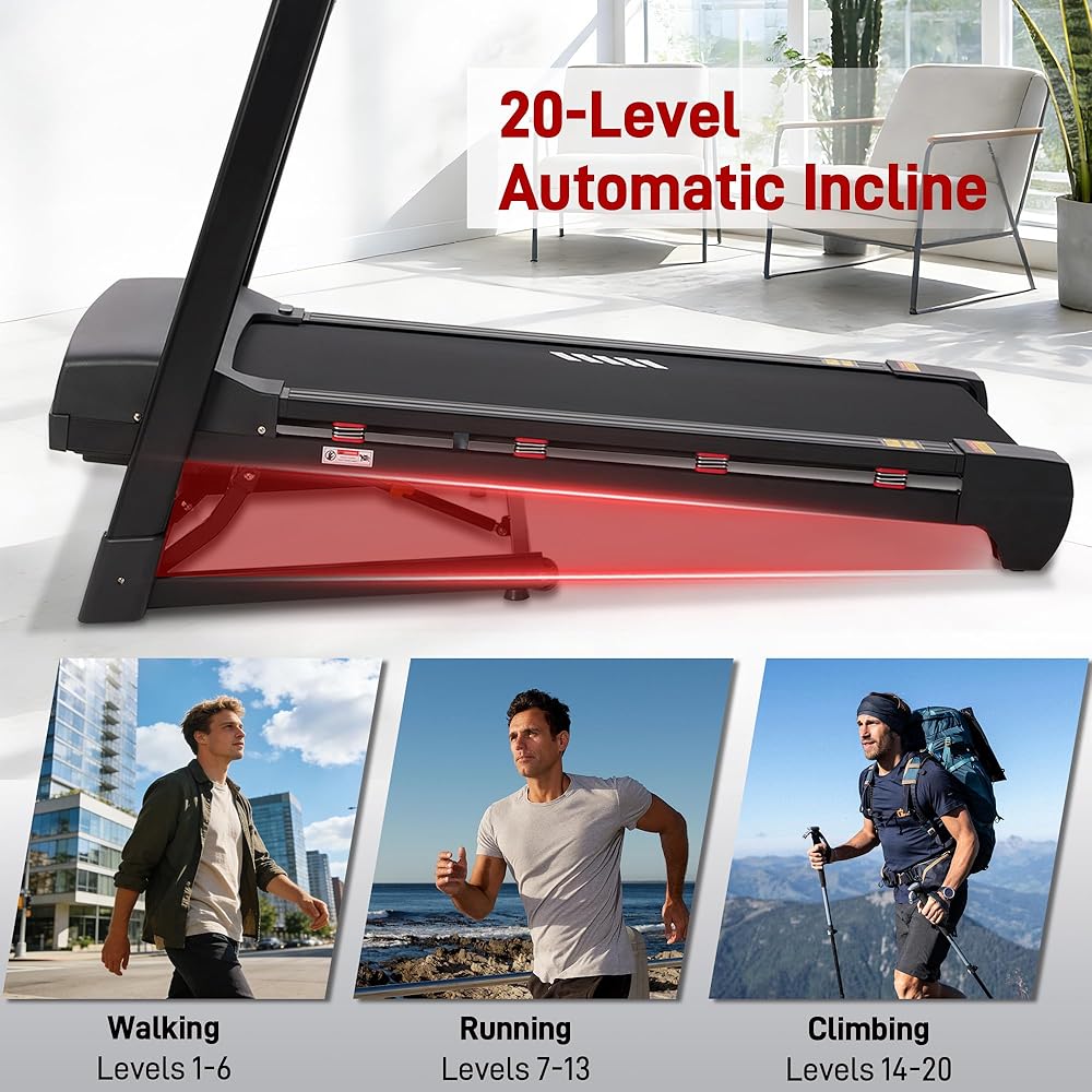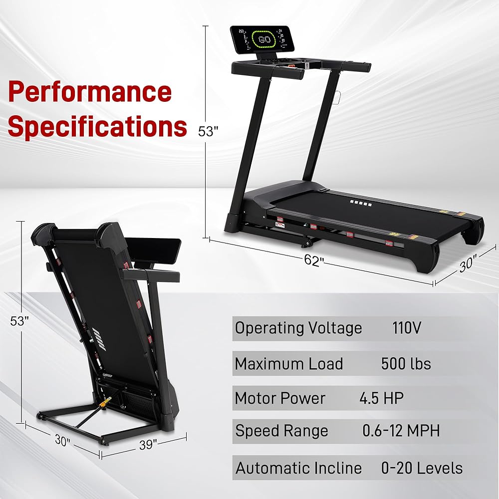 جهاز مشي عالي التحمل للمنزل، جهاز مشي تلقائي بـ 20 مستوى، سعة 500 رطل، سطح عريض 20 بوصة، 0.6-12 ميل في الساعة، 4.5 حصان، شاشة LED، مكبر صوت بلوتوث وتطبيق