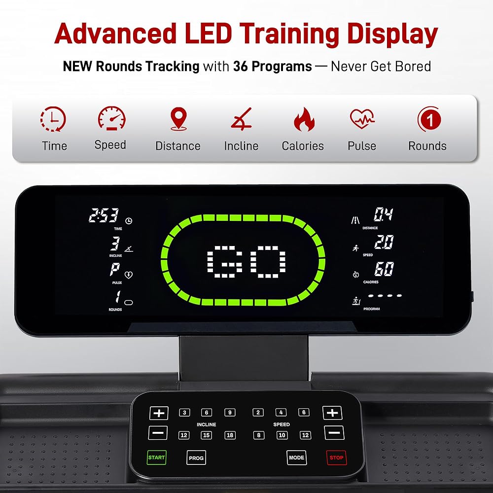 【شاشة LED ذكية، تتبع دائري و36 برنامجًا】ابق على اطلاع على تدريبك مع شاشة LED الذكية التي تعرض السرعة والميل والوقت والمسافة والسعرات الحرارية ومعدل ضربات القلب. استمتع بتجربة تدريب منظم من خلال تتبع الجولات التلقائي الجديد الذي يحاكي مسارًا بطول 400 متر ويسجل كل لفة. اختر من بين 36 برنامجًا محددًا مسبقًا بينما يحافظ جهاز المشي سريع الاستجابة مع الميل التلقائي على ديناميكية التدريبات.