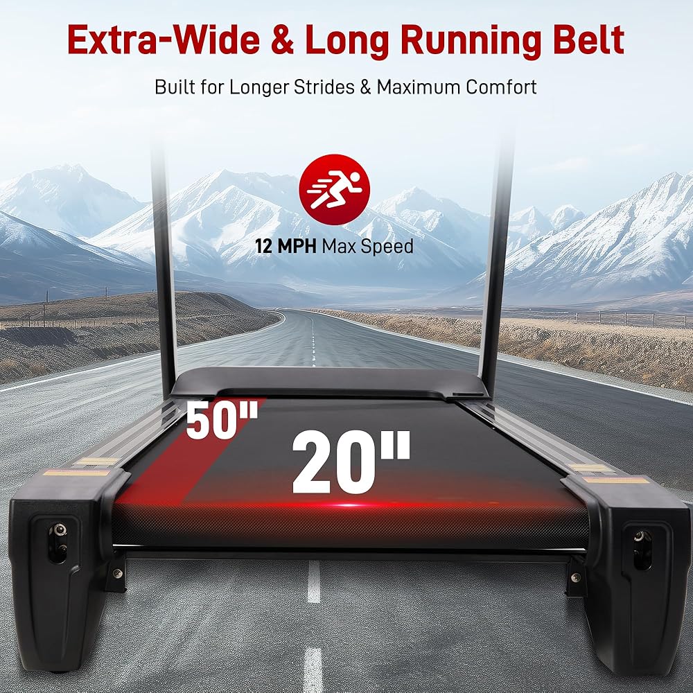 【حزام جري عريض للغاية مقاس 20 بوصة لخطوات واثقة】يوفر سطح الجري مقاس 50 بوصة × 20 بوصة مساحة واسعة للمشي والركض والركض. تعمل جهاز المشي المنزلي الواسع هذا على تعزيز الحركة الطبيعية والقدم المستقر، مما يوفر الراحة والثقة أثناء كل جلسة تمرين.