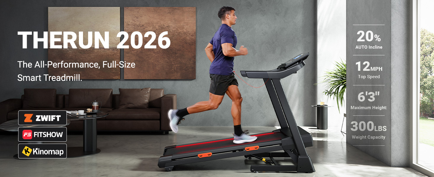 THERUN 12 MPH Treadmill with 20% Auto Incline, 55'' X 20'' Running Belt, Upgraded LCD Screen with Bulit-in Bluetooth Speakers & Fan, 300 LBS Capacity and USB Charging