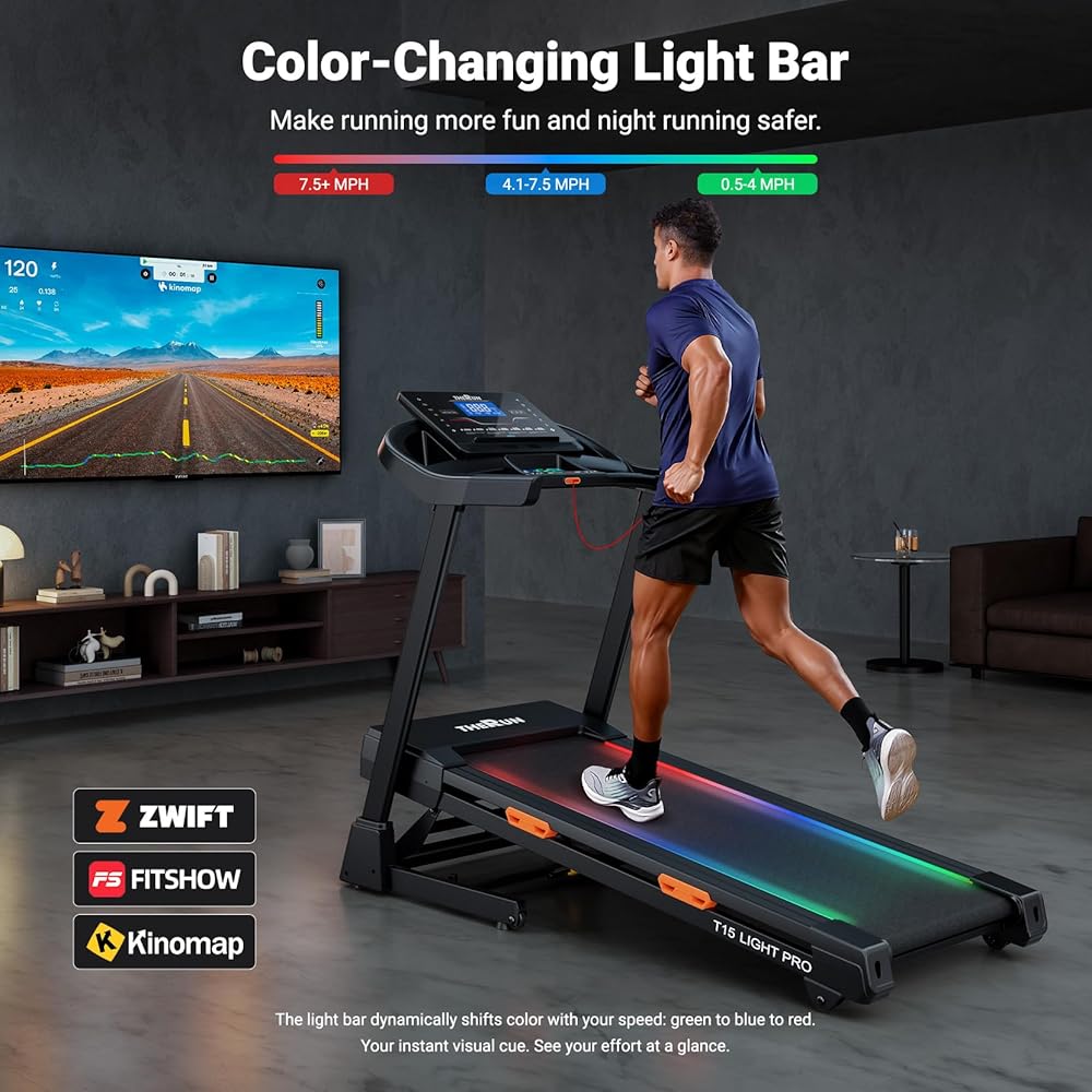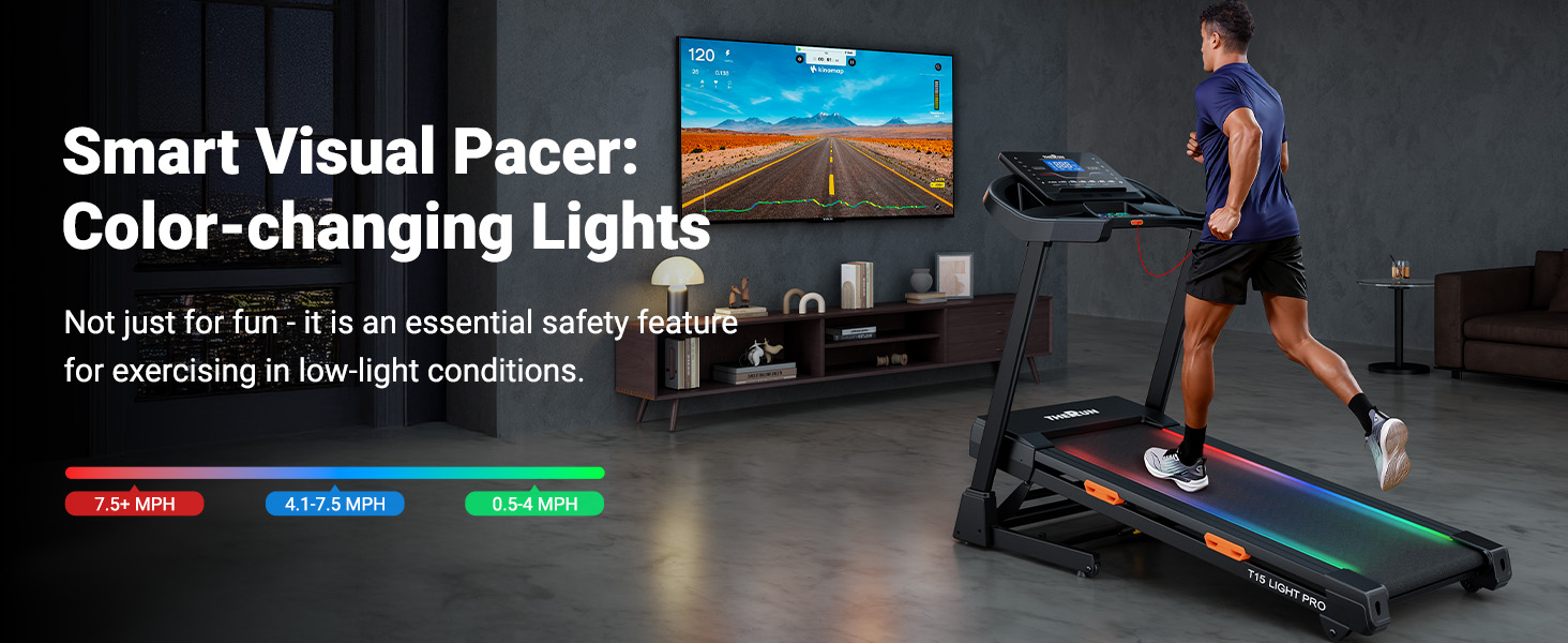【3-App Connectivity & LED Lights】 – Sync this treadmill with auto incline with Zwift, FitShow, or Kinomap for immersive training. Side LED lights change color with your pace (Green: 0.5–4 MPH; Blue: 4.1–7.5 MPH; Red: 7.5+ MPH), adding fun and enhancing safety for a superior folding treadmill experience.