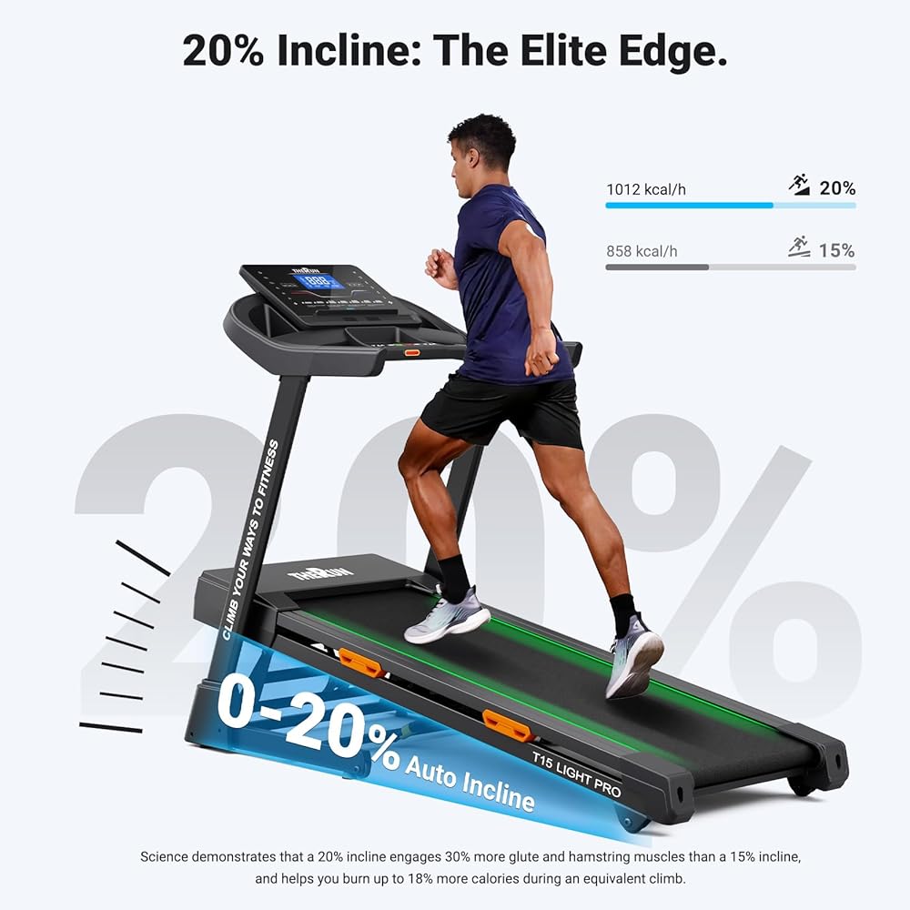 【20% Auto Incline for Maximum Results】– Challenge yourself with an automatic incline that adjusts up to 20%. This auto incline treadmill engages 30% more muscles than 15% incline models, burning more calories to deliver professional-grade results at home.