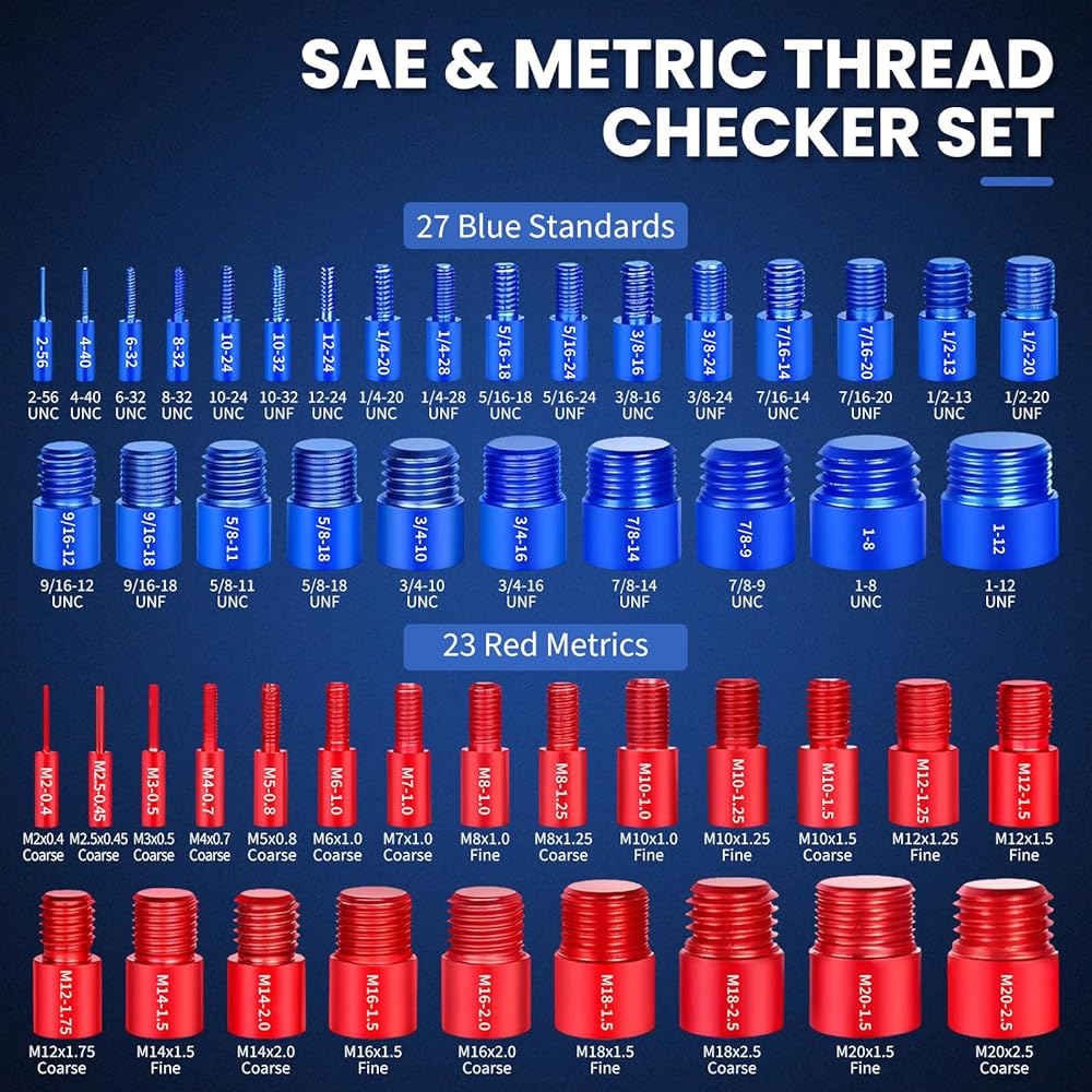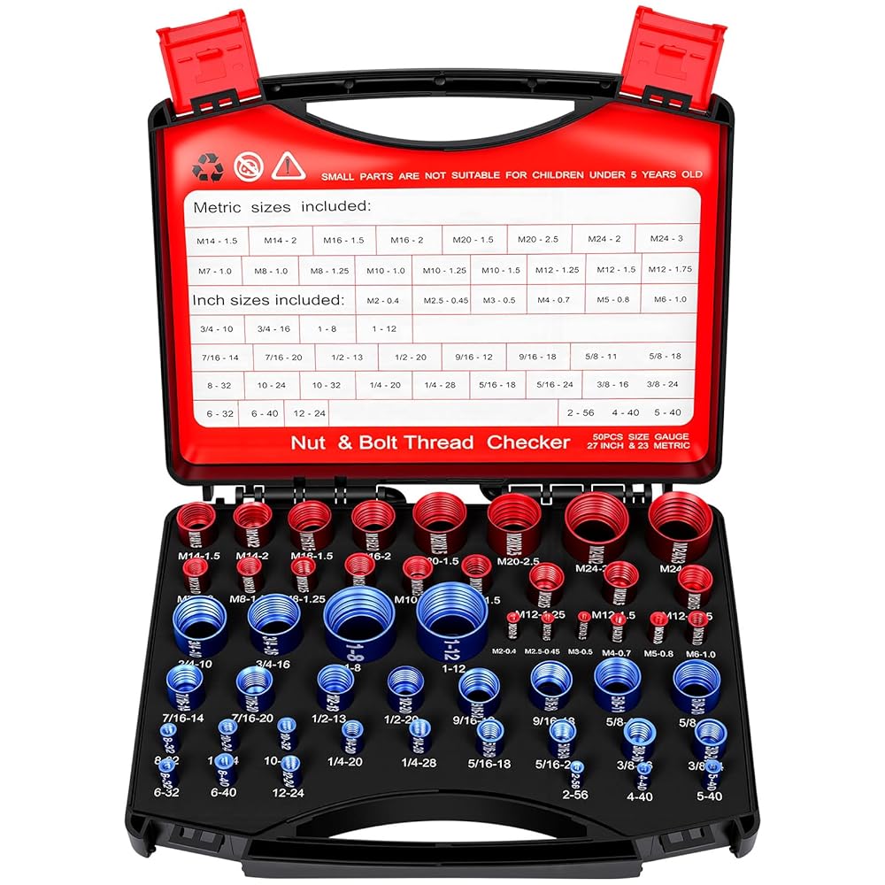 【مجموعة شاملة لفحص الخيوط مكونة من 50 قطعة】 تشتمل مجموعات فحص الخيوط القياسية والمترية لدينا على 27 SAE (قياسي/إمبراطوري) و23 مقياس خيط متري، يغطي مجموعة واسعة من الأحجام من 2-56 UNC إلى 1-12 UNF وM2x0.4 إلى M20x2.5. إنه أداة البحث المثالية عن حجم المسمار ومقياس درجة الخيط للمحترفين ومحترفي الأعمال اليدوية