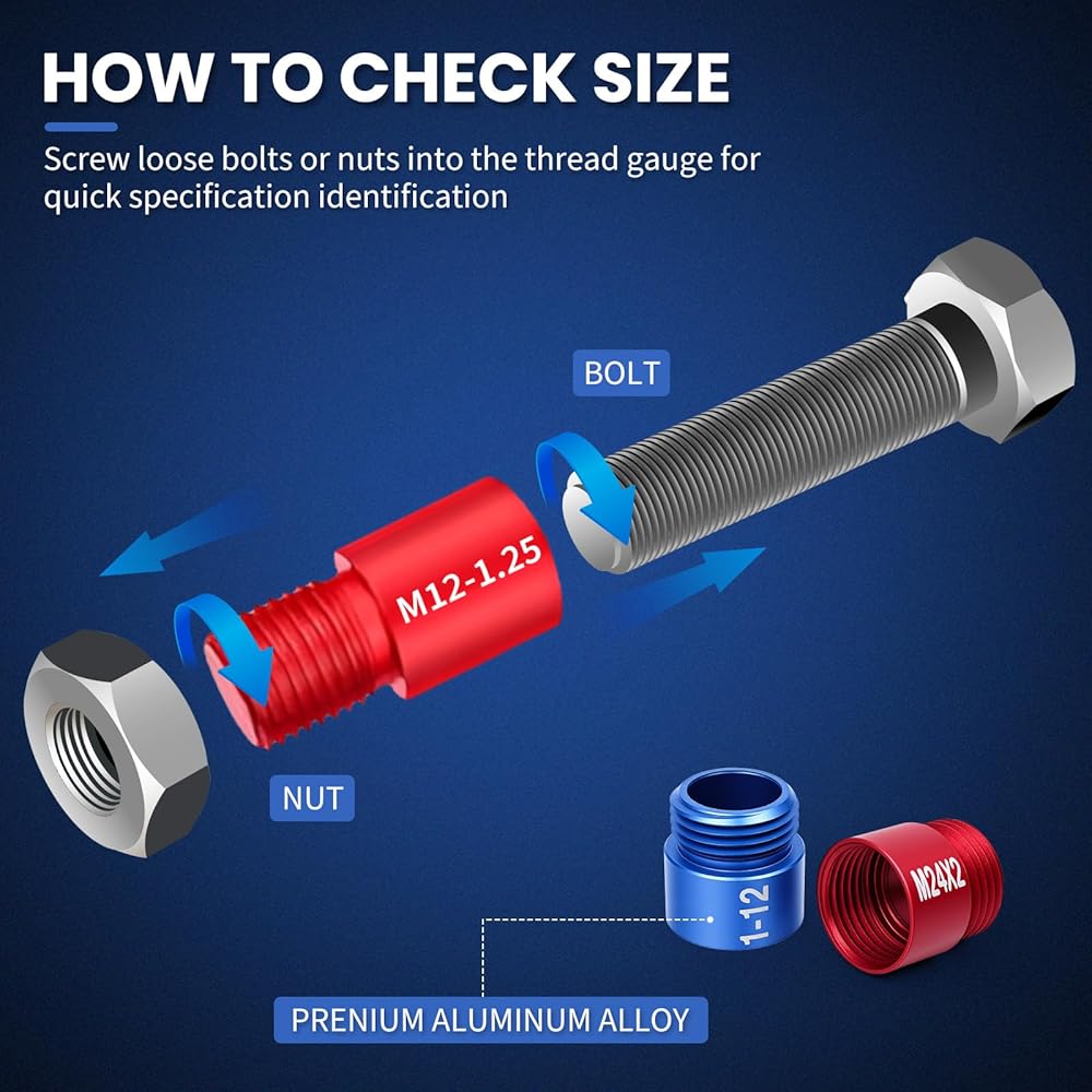 【تصميم متين ومرمز بالألوان】 جهاز فحص خيط الصواميل والمسمار مصنوع من الألومنيوم عالي الجودة مع علامات مقاومة للاحتكاك محفورة بالليزر لضمان وضوح طويل الأمد. يتم ترميز أحجام SAE باللون الأزرق، ويتم ترميز الأحجام المترية باللون الأحمر، مما يسمح بالتعرف الفوري وتقليل الأخطاء