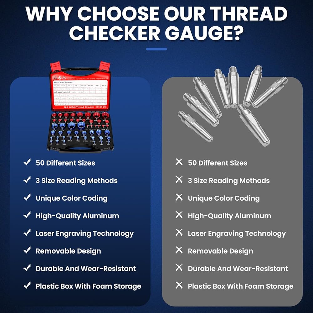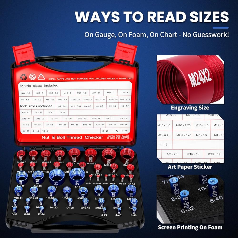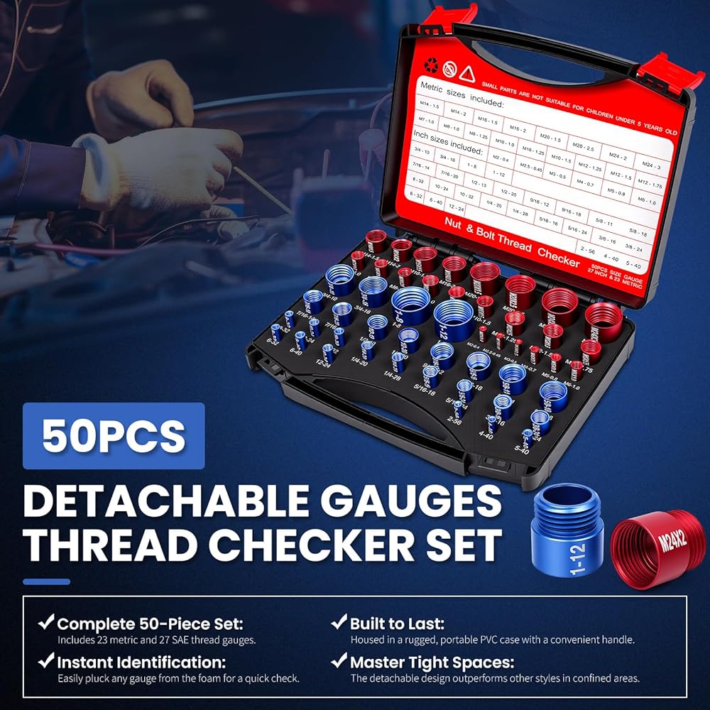 【سهولة التعرف والتخزين المحمول】 يتم تثبيت كل مقياس خيط قابل للفصل بشكل آمن في علبة. يمكنك بسهولة إزالة أداة فحص الخيوط الدقيقة التي تحتاجها للتعرف السريع في المناطق الضيقة أو اصطحبها إلى متجر الأجهزة للعثور على الصمولة أو المسمار المطابق المثالي