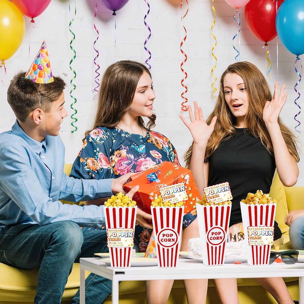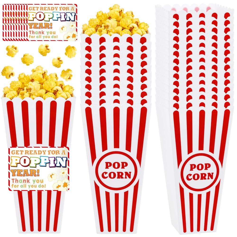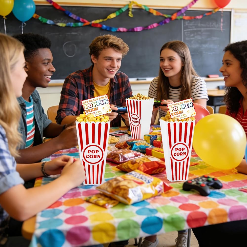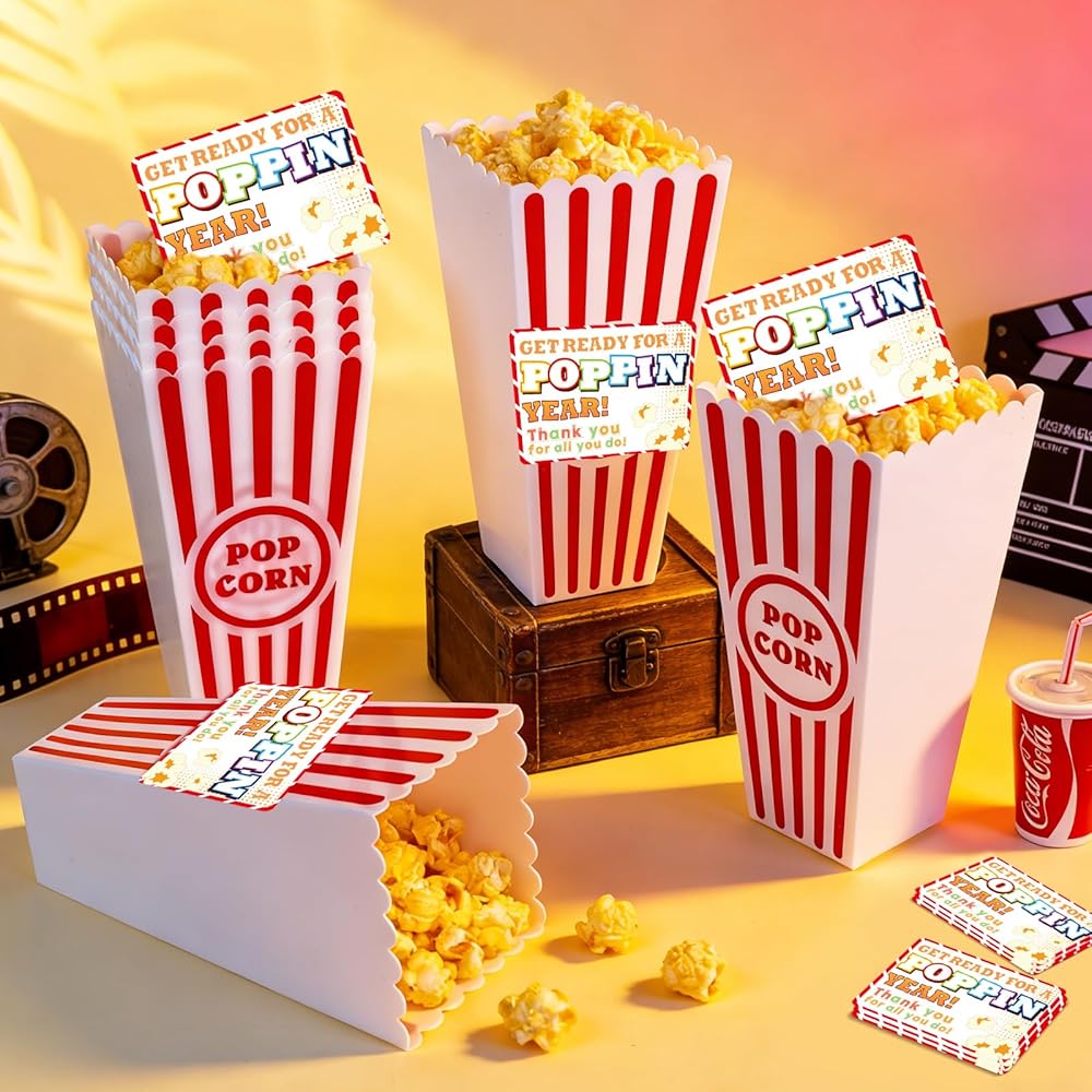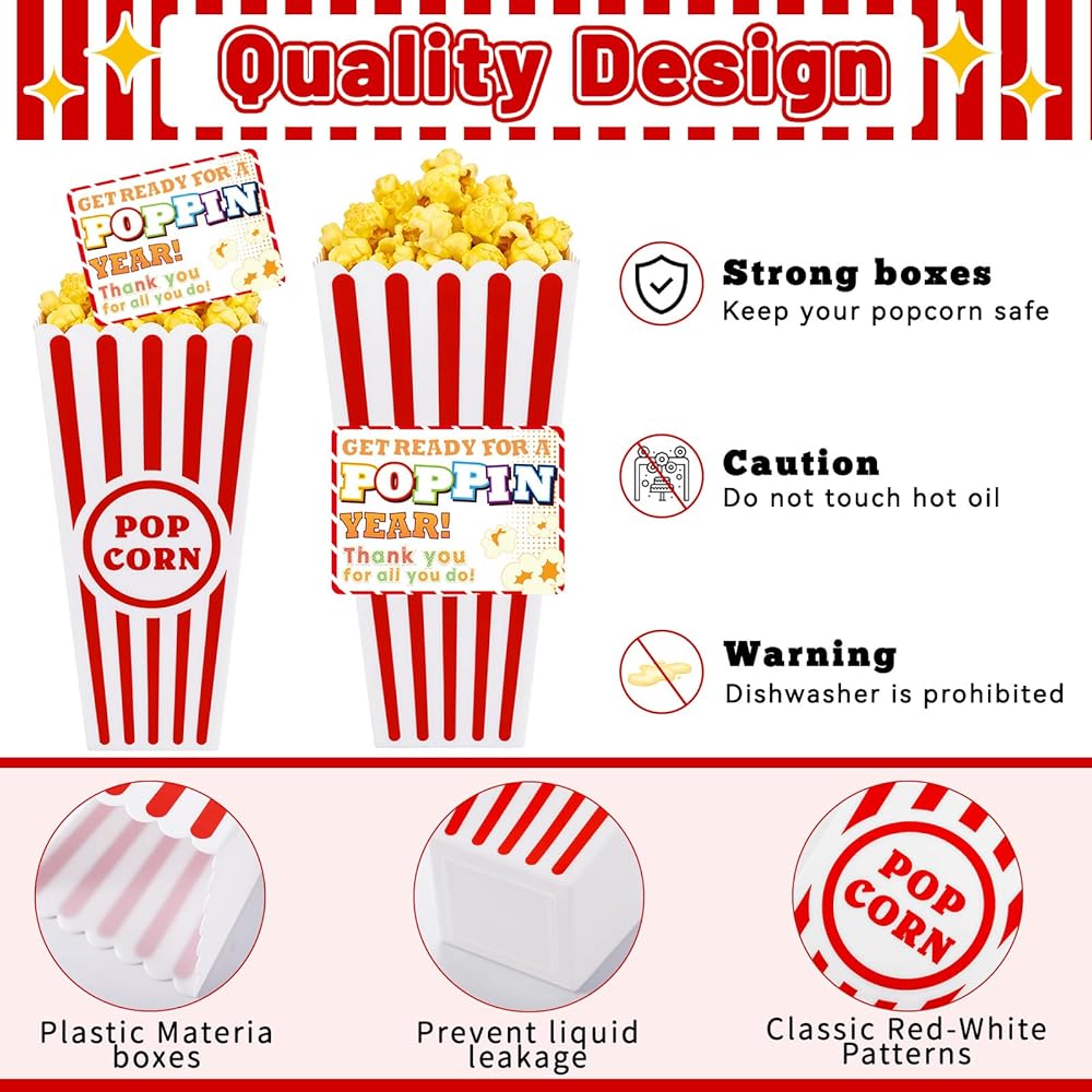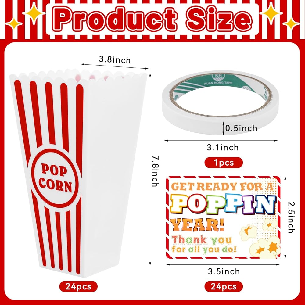 24 Pack End of Year Gifts for Students Packaging: Includes 24-piece plastic popcorn containers (red & white striped), 24 personalized thank you cards, and 1 roll of adhesive sticker tape .Perfect for graduation gift baskets for End of the year students, movie nights, or parties—each box becomes a thoughtful, customizable keepsake. The sturdy 3.8" square opening and 7.8" depth hold snacks securely while the nostalgic design ensures every gift feels special.
