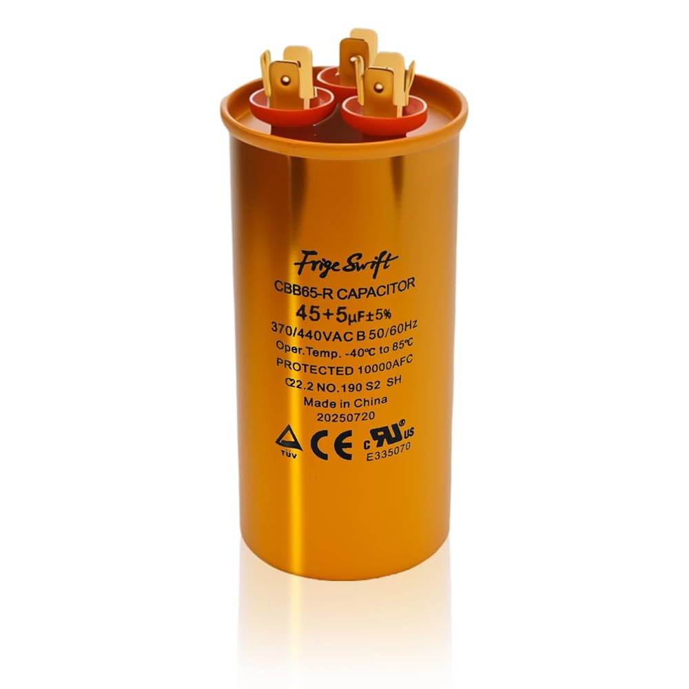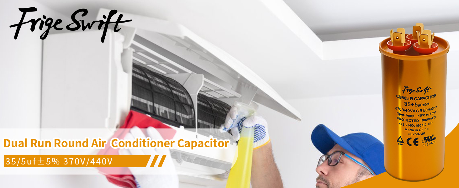• Frigeswift 35 + 5 فائق التوهج ± 5٪ 370 فولت / 440 فولت CBB65 مكثف بدء دائري مزدوج التشغيل.