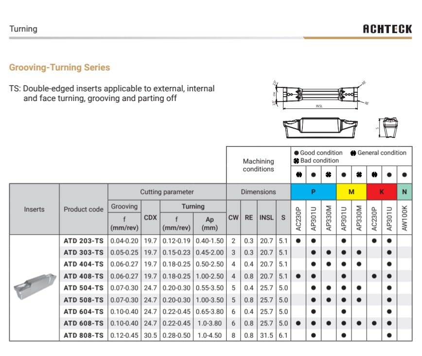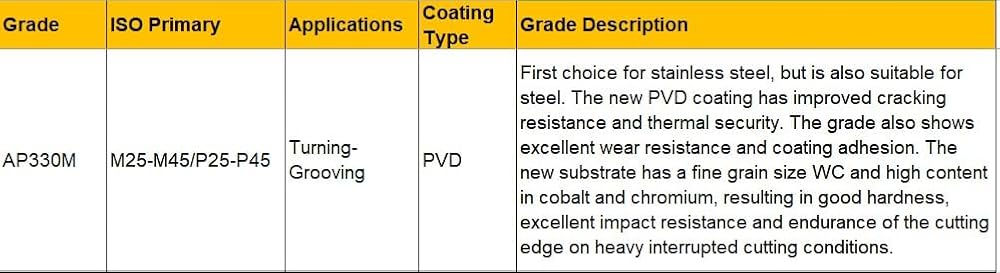- Double-edged inserts applicable to external turning, grooving and profiling