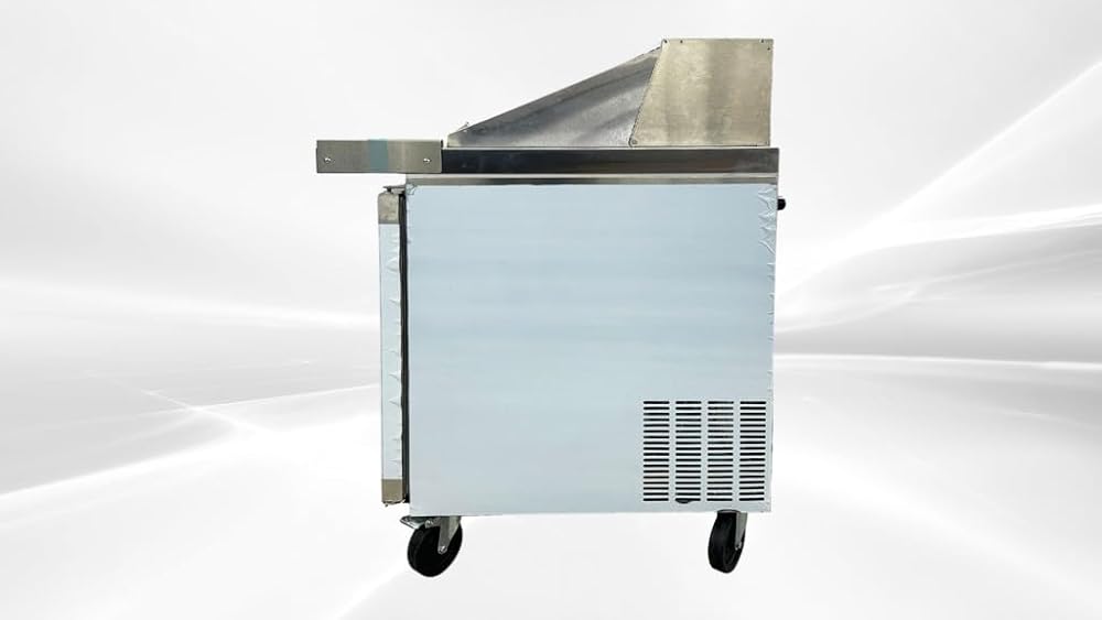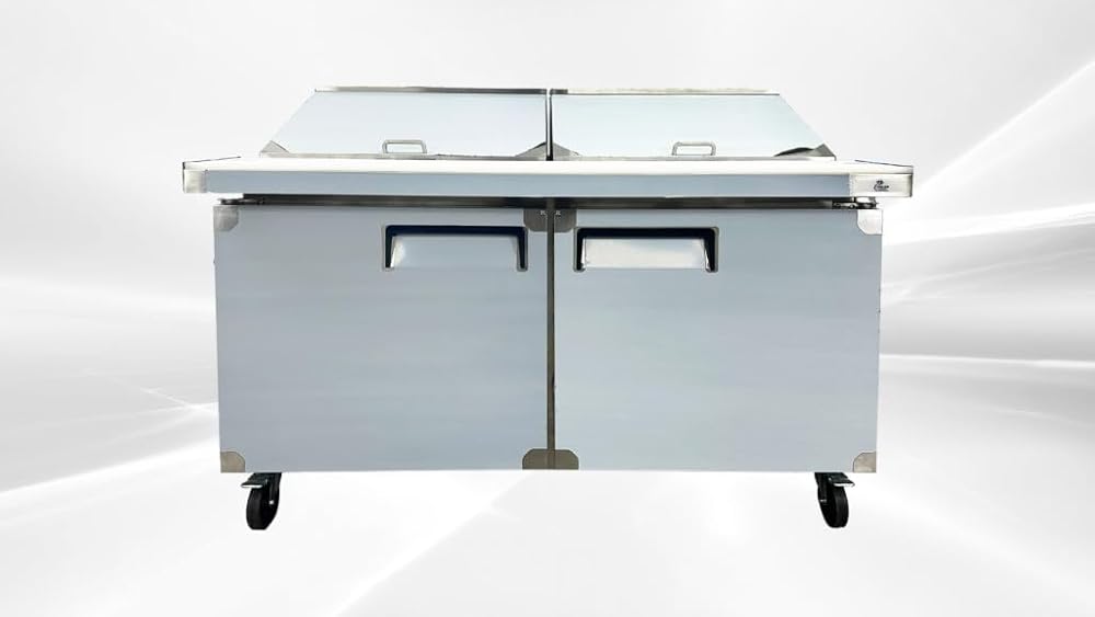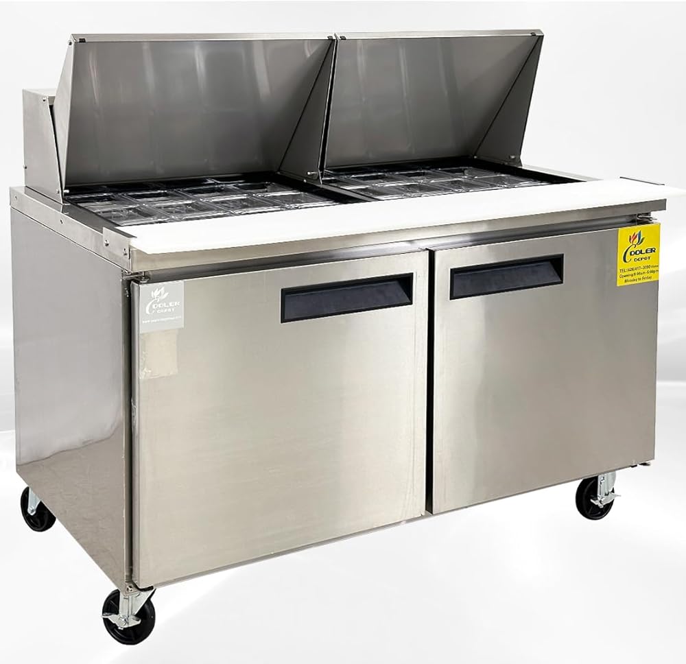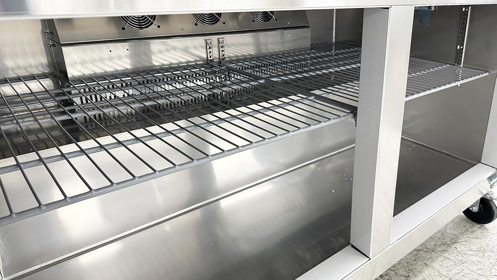 • REFRIGERATED STORAGE: Beneath the workspace is additional 17 cuft Two doors storage space. Because it's refrigerated at temperature of 33°F to 41 °F ( or 0°C to 5°C), the space is great for storing back-up ingredients, such as deli meat and cheese, as well as less common toppings. The epoxy-coated shelves are included and can each accommodate up to 90 lb. of weight, helping to organize your assorted supplies