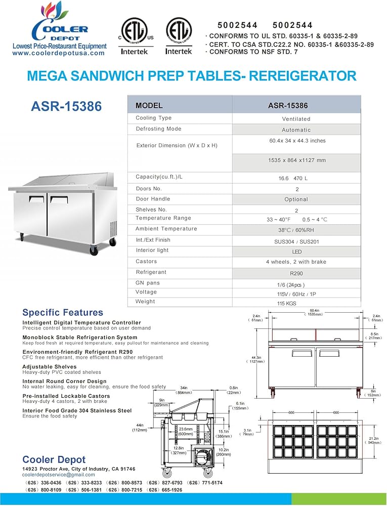 Product Features/Specs -Stainless Steel prep table -24 pans included -115v / 60Hz -Insulated lid for food preservation -Cutting board -24 Unit storage bins (No lids) -Health Inspection Approved -Standard Plug In -Ready for use. Multi purpose unit -3 Year Warranty on Parts -6 Year Warranty on Compressor (Warranty does not cover labor)