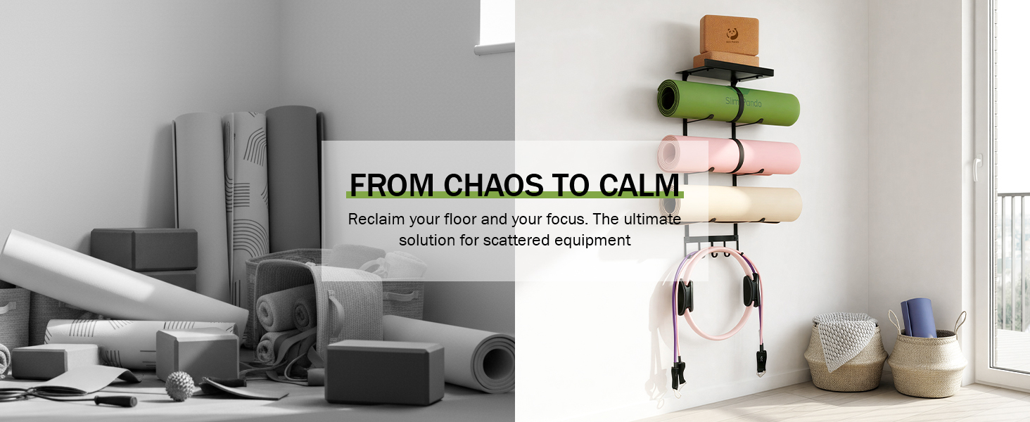 رف معدني عائم و5 خطافات: يتميز حامل سجادة اليوغا الجداري الخاص بنا برف عائم معدني عالي التحميل - متفوق على الرف الخشبي الهش - مثالي لتخزين مكعبات اليوغا أو المناشف أو حتى النباتات الصغيرة. 5 خطافات لأشرطة المقاومة، وأشرطة اليوجا، وحبال القفز، وحقائب الصالة الرياضية، مما يجعل حامل حائط بساط اليوجا هذا مركزًا مركزيًا حقيقيًا لمعدات اللياقة البدنية الخاصة بك.