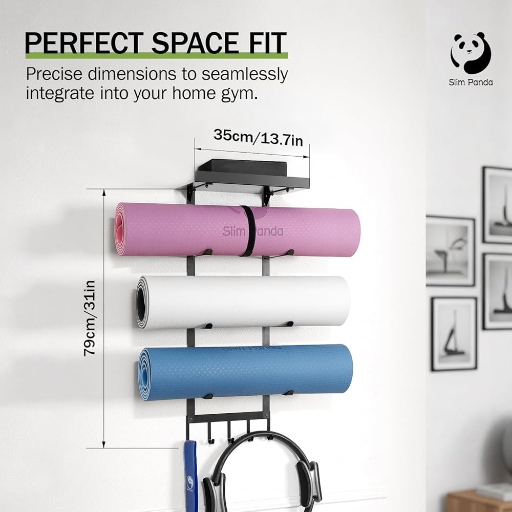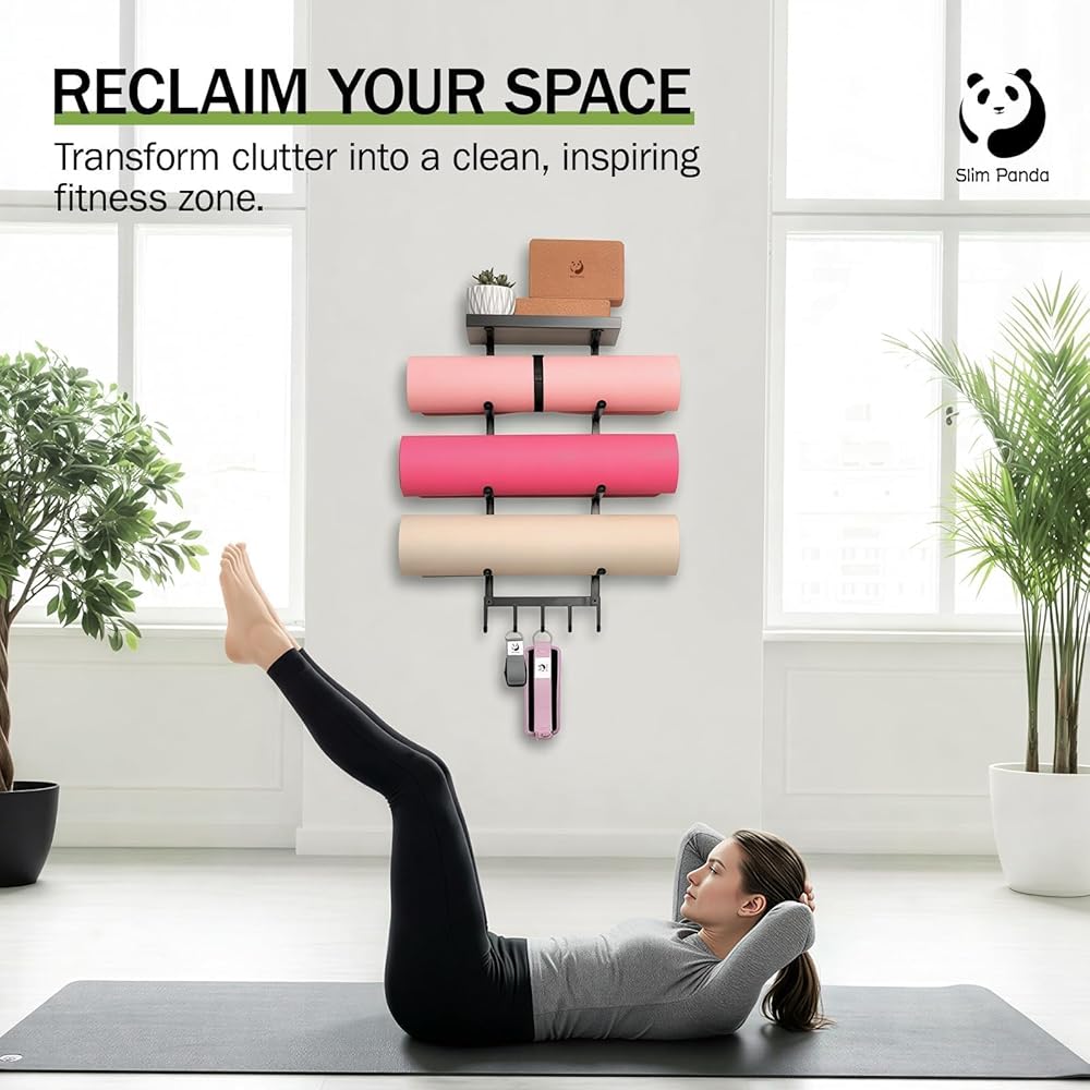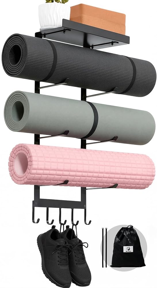 قم بزيادة المساحة وتنظيم صالة الألعاب الرياضية الخاصة بك: حافظ على منزلك مرتبًا مع حامل سجادة اليوجا المكون من 4 طبقات الذي يتم تثبيته على الحائط. منظم سجادة اليوجا الموفر للمساحة يحمل بكفاءة العديد من السجادات والمعدات، مما يوفر مساحة أرضية. إنه الحل المثالي لتخزين صالة الألعاب الرياضية المنزلية لترتيب منطقة التمرين وتنظيمها.