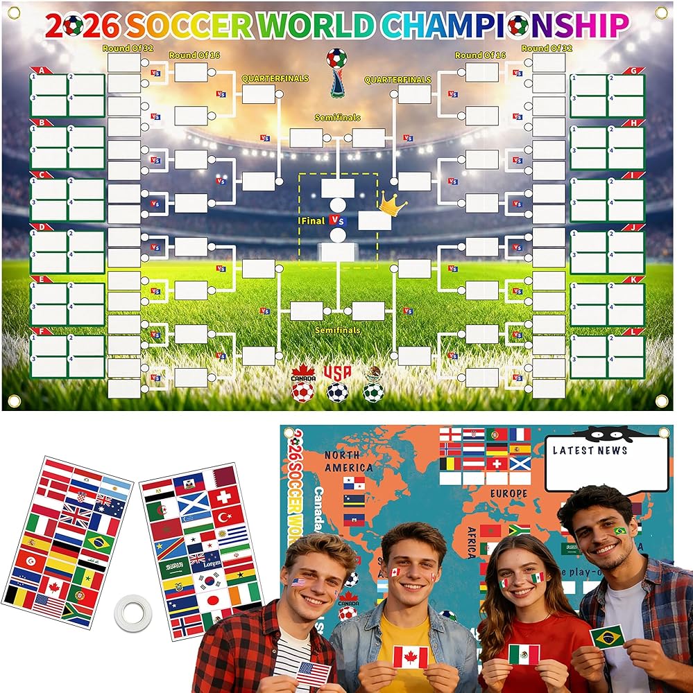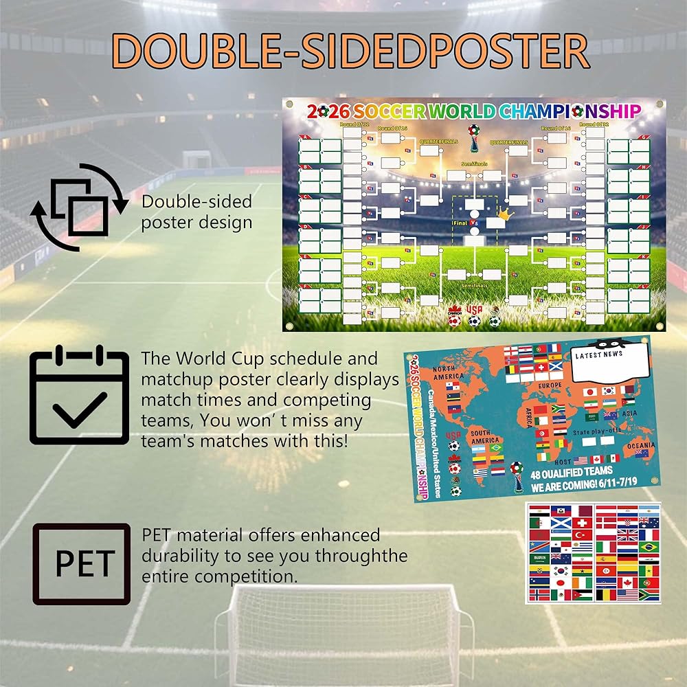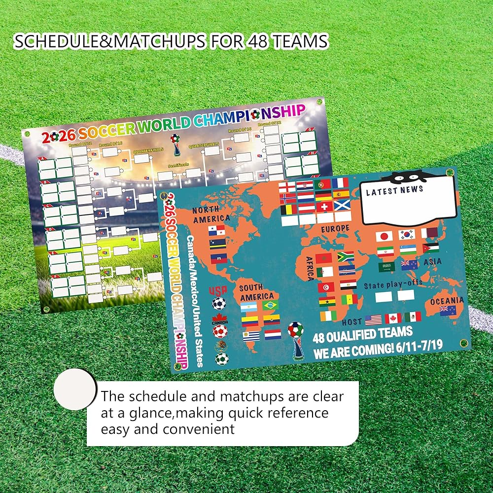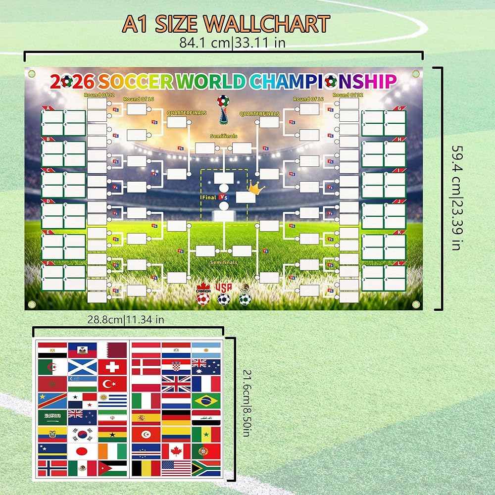 ملصق جدول كأس العالم لكرة القدم 2026 من Cuteiush ومخطط جداري - قماش حاجب للضوء مقاس 23 × 33 بوصة مع ملصقات أعلام وطنية قابلة لإعادة الاستخدام، متتبع مرحلة المجموعات المكونة من 48 فريقًا، ديكور حفلات كرة القدم
