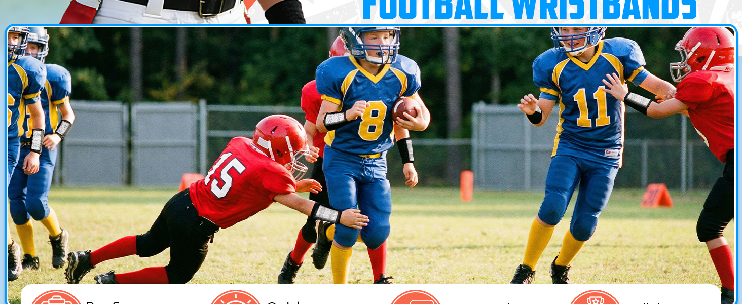 يبلغ مقاس أساور المعصم المخصصة للعب كرة القدم 5.9 سم عرضًا و3.54 سم ارتفاعًا. سوار معصم كرة القدم ثلاثي النوافذ (مقاس 4.3 بوصة عرض × 2.4 بوصة) يتميز بالشفافية والوضوح، مما يسمح للاعبين بمراجعة بطاقات قواعد اللعبة (مثل الطرق الهجومية والمواقع الدفاعية) في أي وقت. فهو يساعد على تقليل أخطاء الاتصال في الميدان وتحسين كفاءة التنفيذ