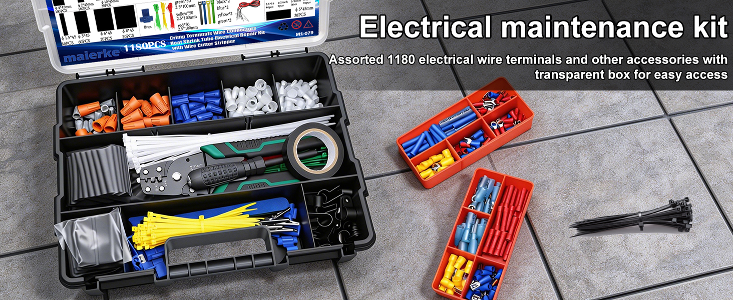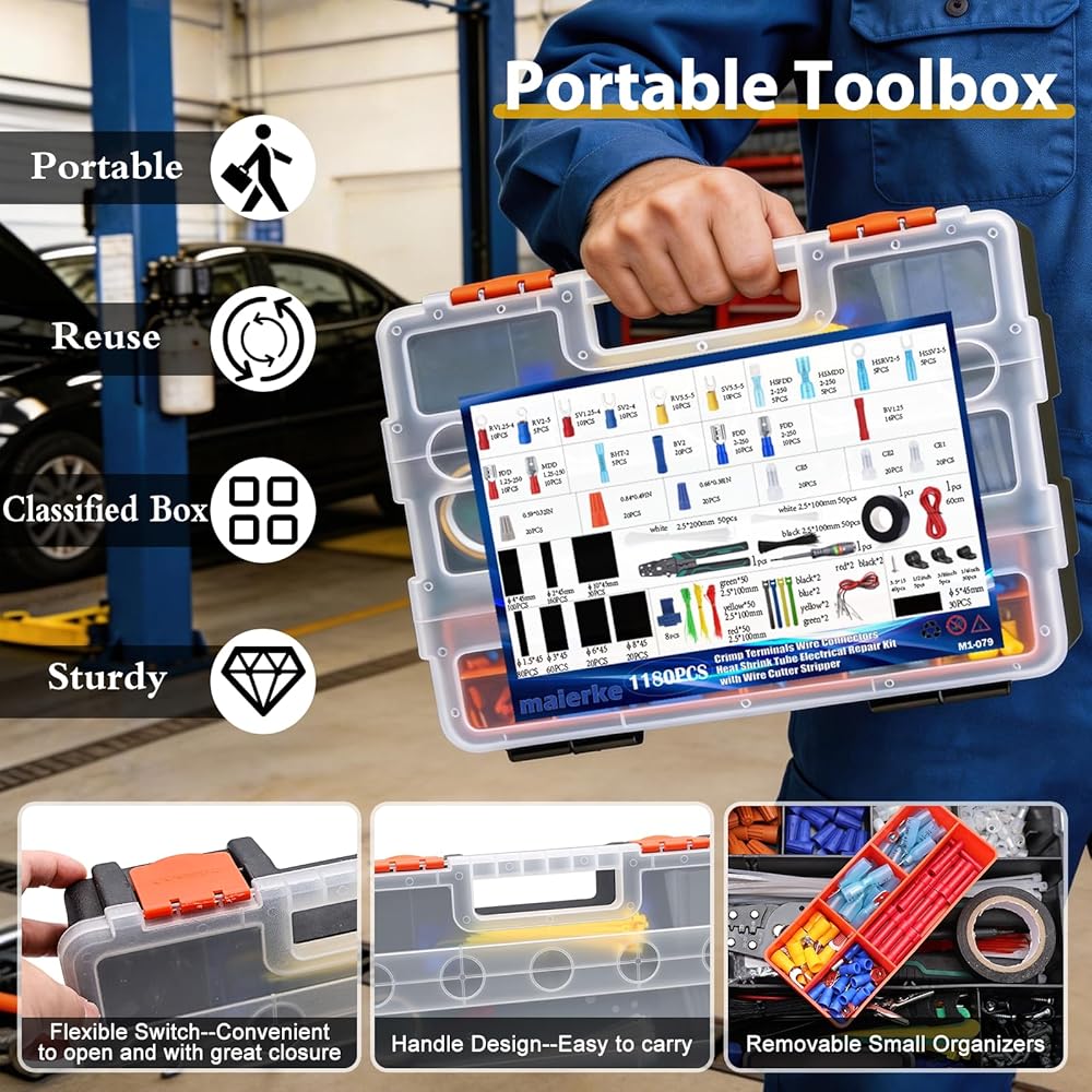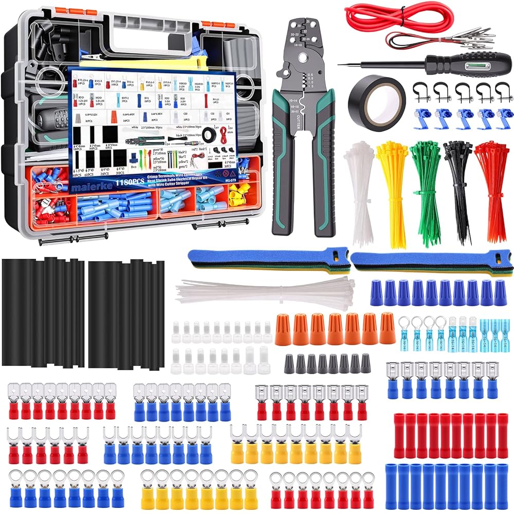 مجموعة الكل في واحد كاملة: تتضمن هذه المجموعة الطرفية المكونة من 1180 قطعة كل ما تحتاجه للأسلاك والتوصيل والتنظيم. تحتوي على 276 قطعة من الأطراف المعزولة (الحلقة، الشوكة، الأشياء بأسمائها الحقيقية، المؤخرة)، 8 قطع موصلات متشابكة، 8 قطع من ربطات الفيلكرو، 300 قطعة من ربطات الكابلات النايلون، 40 قطعة من مشابك الكابلات، 40 قطعة من البراغي M3.5*13، 500 قطعة من أنابيب الانكماش الحراري السوداء، 4 قطع من مشابك التمساح، أداة قطع الأسلاك/أداة تجعيد، سلك طاقة 60 سم 1 مم مربع، جهاز اختبار الجهد الكهربي مفك براغي وشريط كهربائي - كلها معبأة في علبة تخزين محمولة متينة مزدوجة الطبقة.