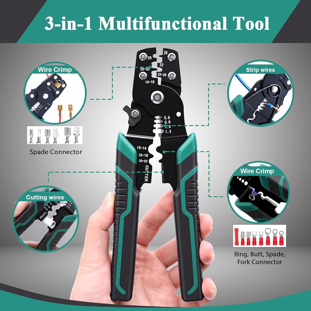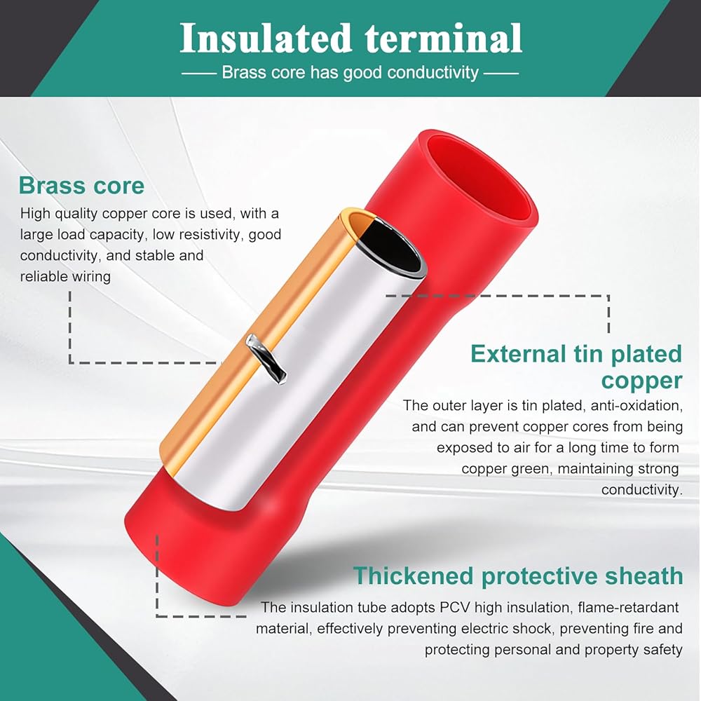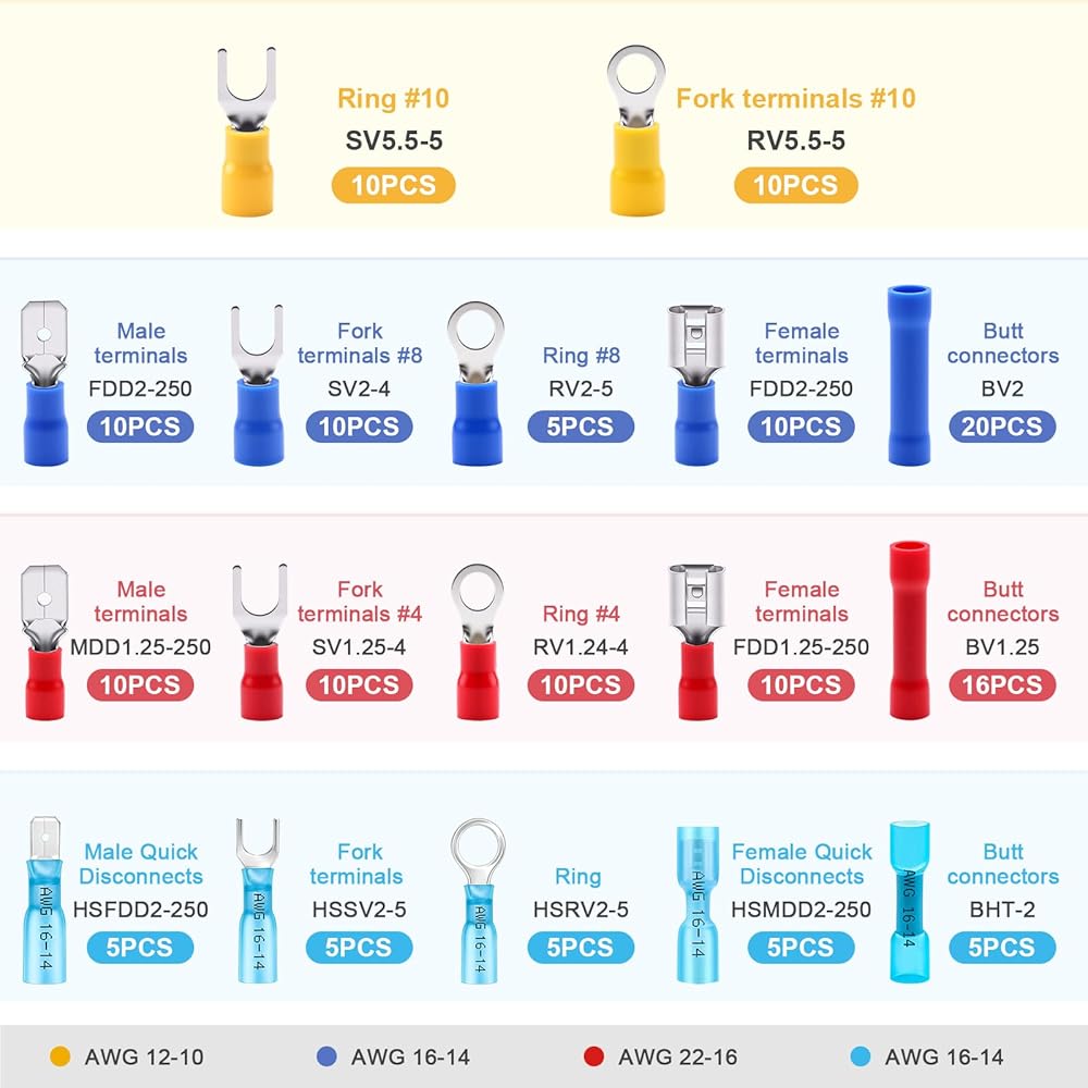 أطراف عالية الجودة: أطراف التجعيد الخاصة بنا مصنوعة من النحاس المصبوغ مع موصلية ممتازة ومقاومة للتآكل. الأكمام العازلة مصنوعة من مادة PVC عالية الجودة، مما يضمن توصيلات آمنة وموثوقة. تم وضع علامة واضحة على المحطات الطرفية بالأحجام والألوان (الأحمر 22-16 AWG، الأزرق 16-14 AWG، الأصفر 12-10 AWG) للتعرف السريع.