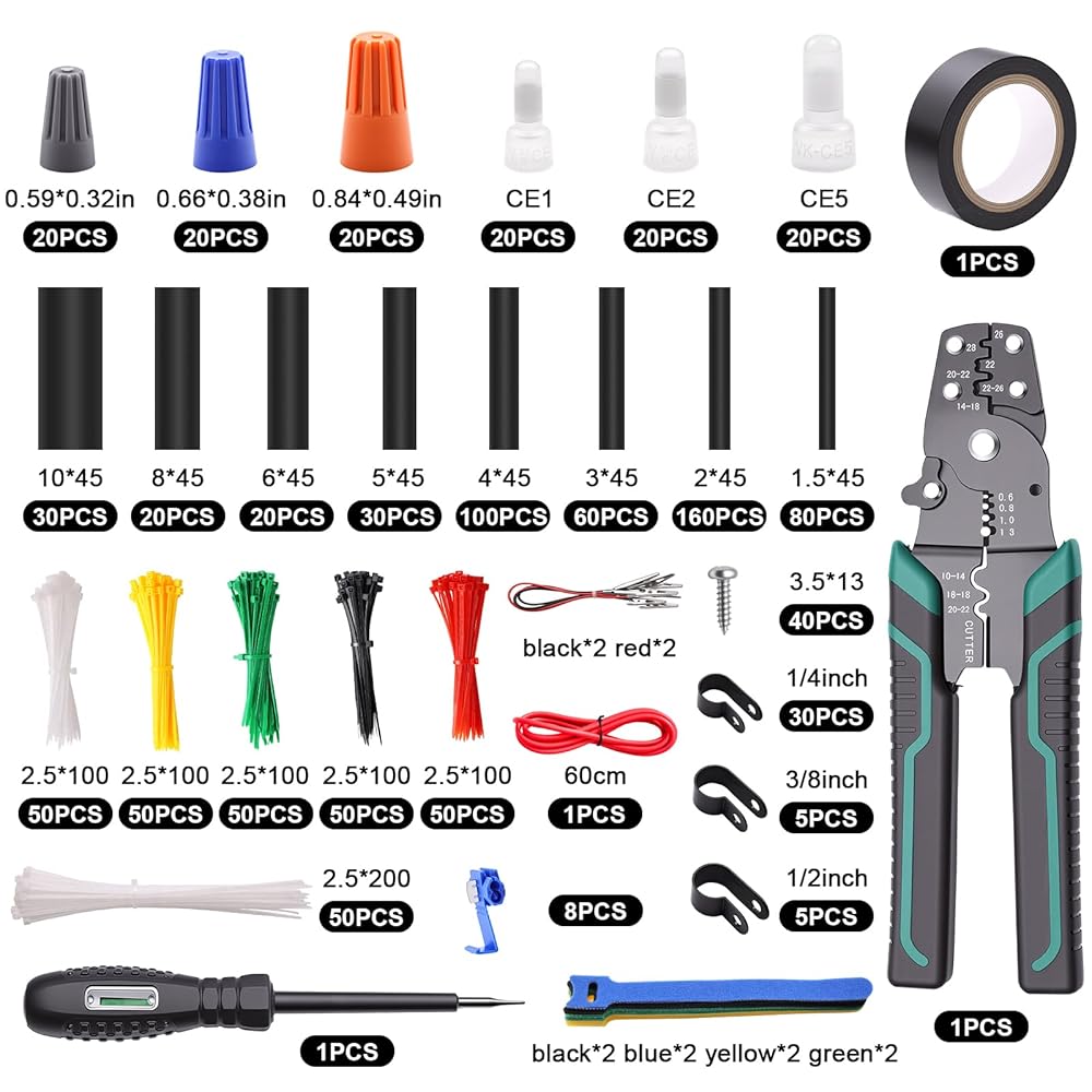 يغطي 99% من احتياجات الأسلاك: يتضمن أنواع الأطراف الأكثر استخدامًا: الحلقة المعزولة، والشوكة، والمجرفة، وموصلات المؤخرة، بالإضافة إلى إصدارات الانكماش الحراري للحلقة، والشوكة، وموصلات المؤخرة. يتضمن أيضًا أغطية سلكية ومحطات CE (الحلقات). تلبي المجموعة المعايير الكهربائية وهي مثالية لمشاريع السيارات والمنزلية والبحرية والصوتية والمشروعات اليدوية.