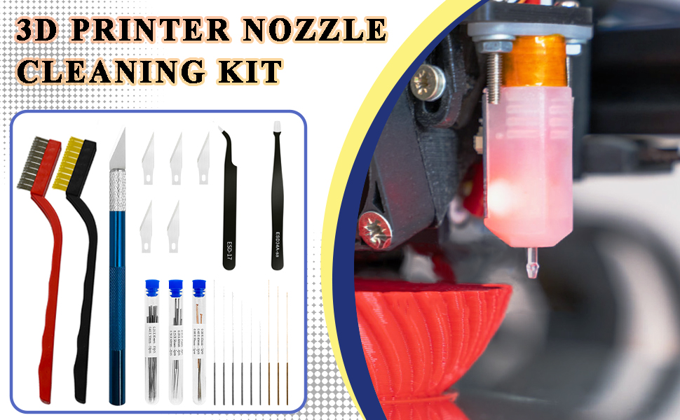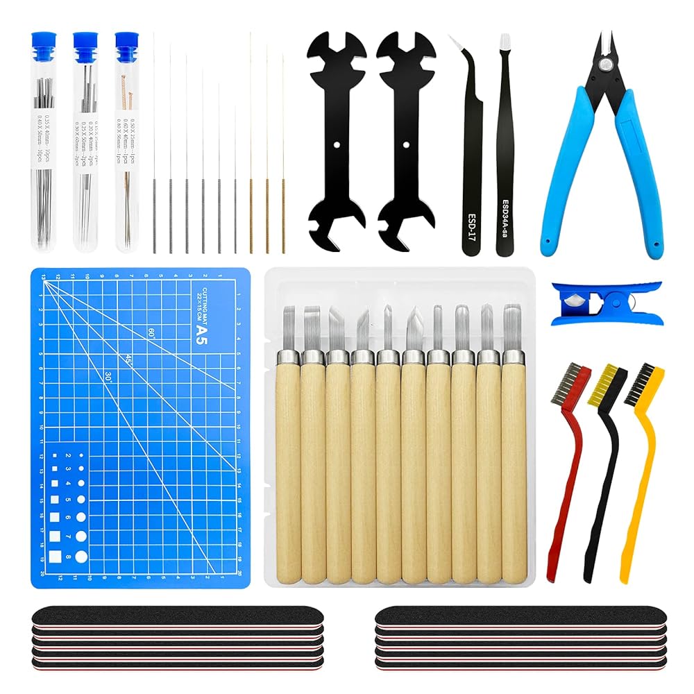 مجموعة أدوات الطابعة ثلاثية الأبعاد المكونة من 42 قطعة: يتضمن المنتج 31 × إبرة تنظيف الفوهات، 2 × فرش سلكية، 2 × ملاقط، 1 × سكين نحت (يحتوي على 5 شفرات بديلة)، 1 × حقيبة أدوات بسحاب لسهولة الحمل والتنظيم