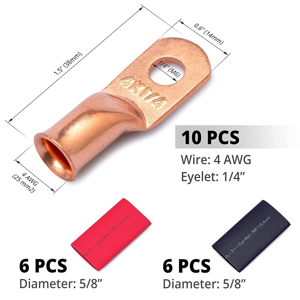 كل ما تحتاجه في عبوة واحدة - عروات نحاسية ذات فتحات مقاس 4 Awg 1/4 بوصة (10 قطع) + أنابيب انكماش حراري بنسبة 3:1 (12 قطعة).