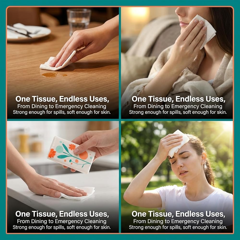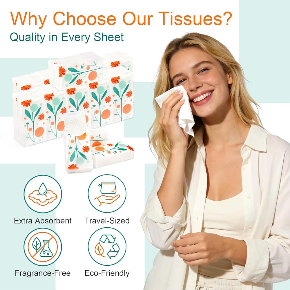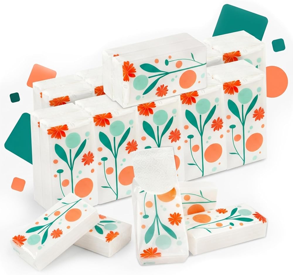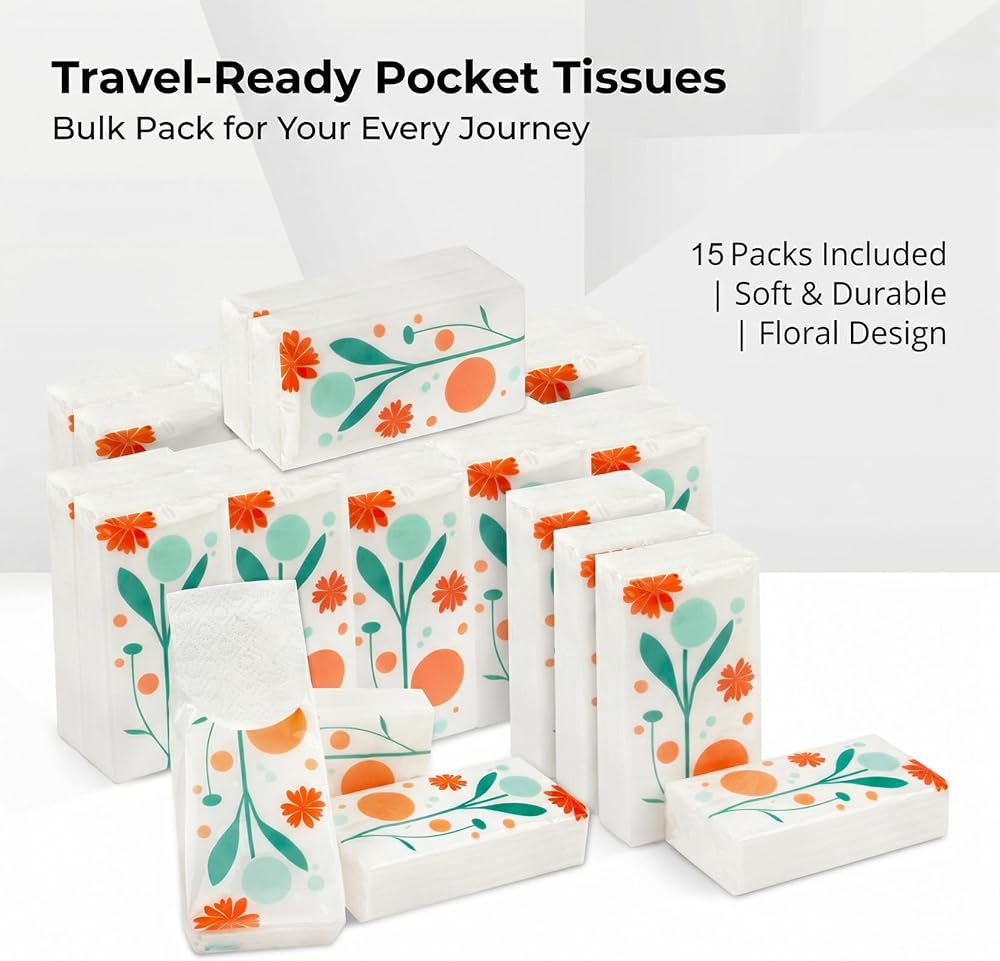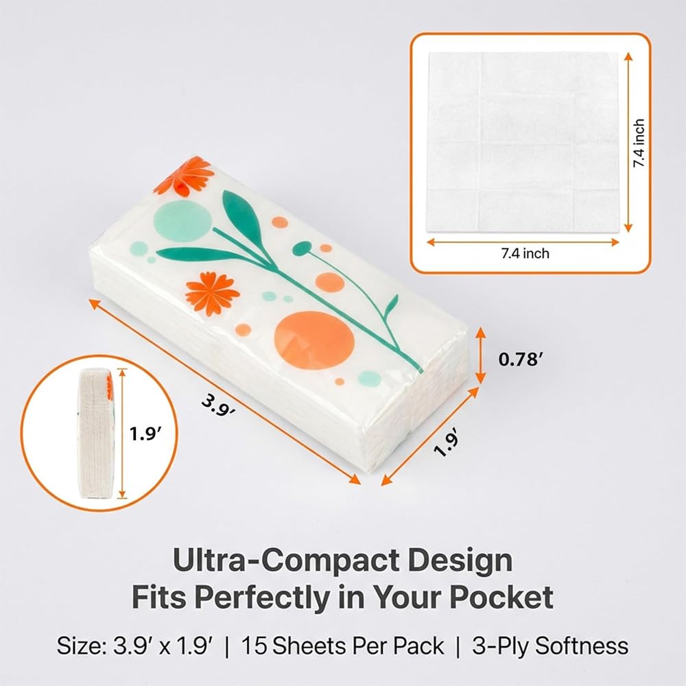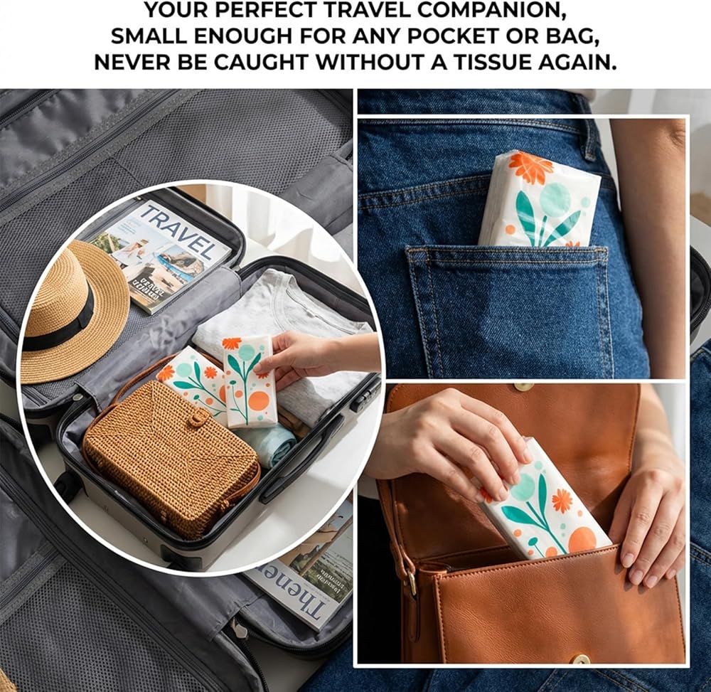 Our travel tissues packs bulk features a stylish floral design that adds a touch of elegance to your dining table, bedroom, or living room. Pocket pack tissues perfect for bathrooms, living rooms, offices, and classrooms, tissue pack is a beautiful choice for home and travel.