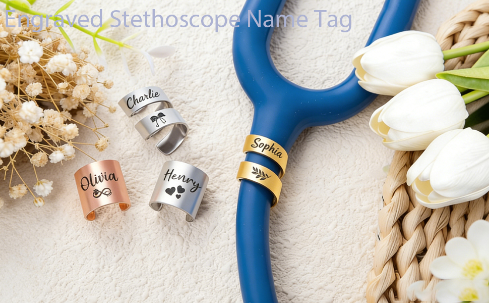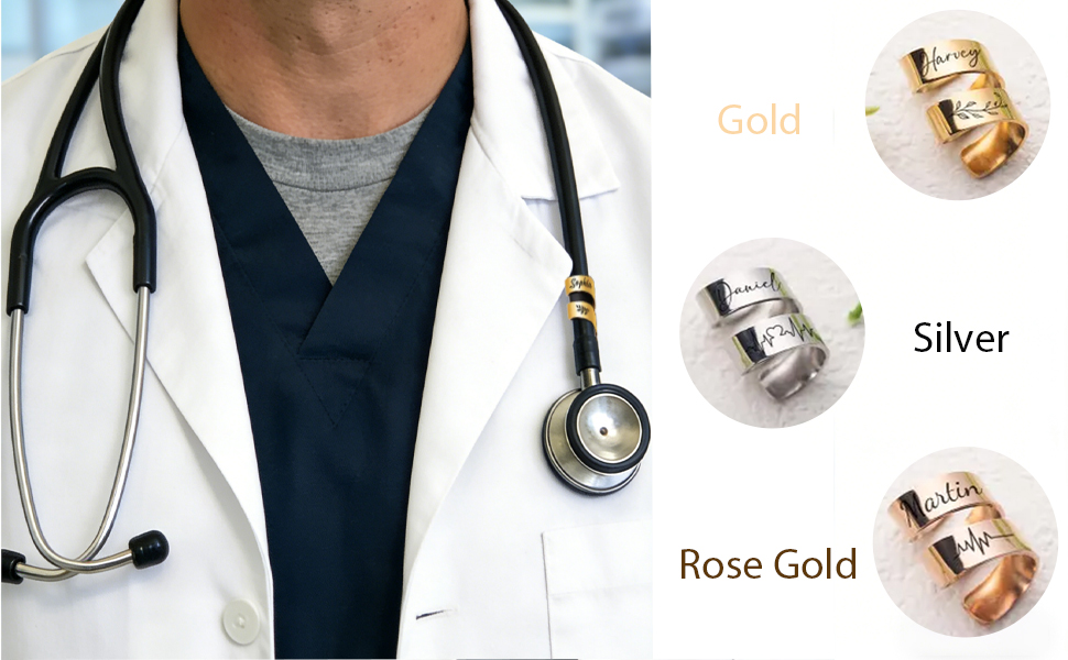 لوحات أسماء سماعة طبية مخصصة مع نقش مخصص: يتيح لك النقش المخصص إضافة اسمك أو لقبك أو أيقونتك المهنية (على سبيل المثال، ممرضة مسجلة أو ممرضة مساعدة أو وحدة العناية المركزة) لإنشاء شارة تعريف فريدة لسماعة الطبيب تعرض احترافك وشخصيتك - الهدية المثالية لخريجي التمريض