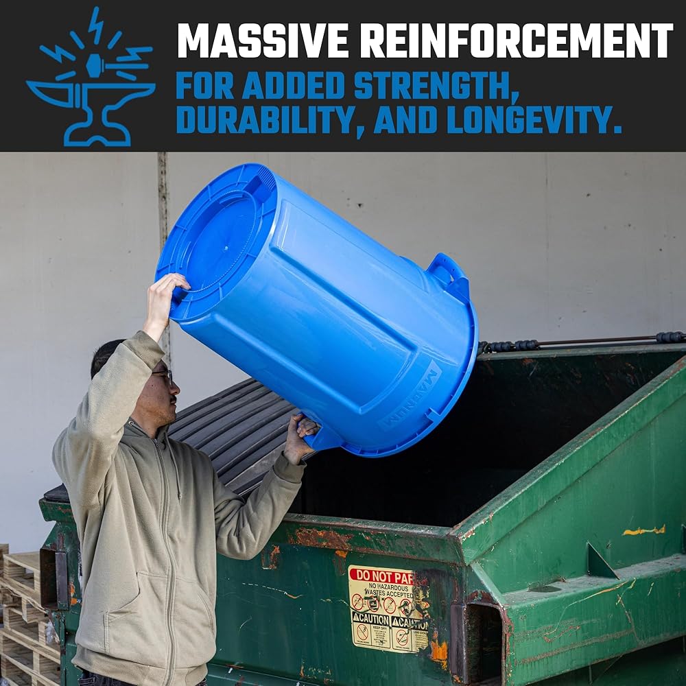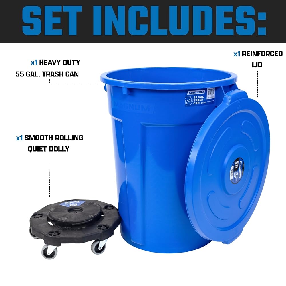 مجموعة سلة المهملات سعة 55 جالون من ماغنوم بلو (سلة المهملات، دوللي هادئة، وغطاء مقوى)، درجة البناء، موقع العمل جاهز للتعامل مع القمامة CMTC-CLD0-55B01 (مجموعة واحدة)