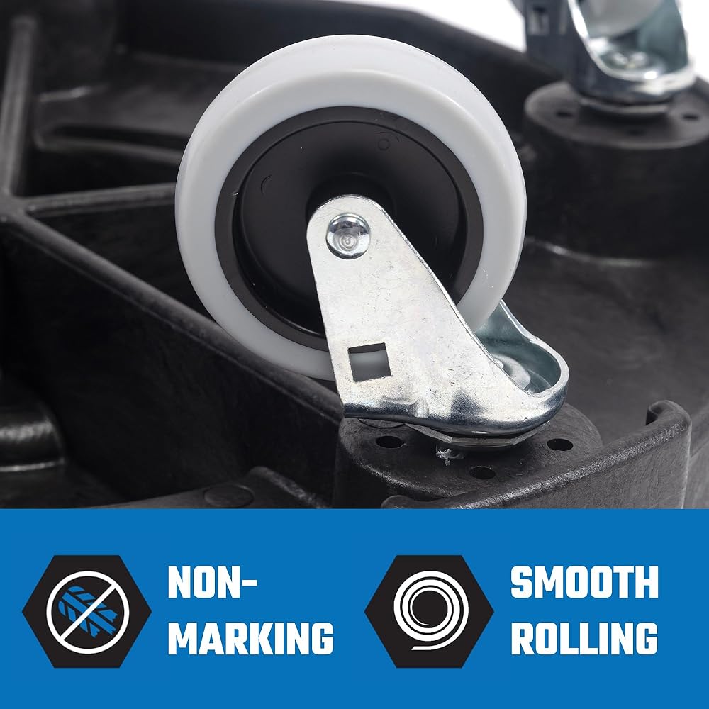 DURABLE HEAVY DUTY PLASTIC: Our construction grade blue trash can is made of high-quality plastic resistant to UV rays, making this garbage can perfect for even the most extreme environments, without fading, warping, cracking or crushing. Our premium garbage can dolly is made with high quality polypropylene plastic designed with sturdy structural supports along the casters providing a firm trash can roller base able to support up to 440 lbs of refuse.