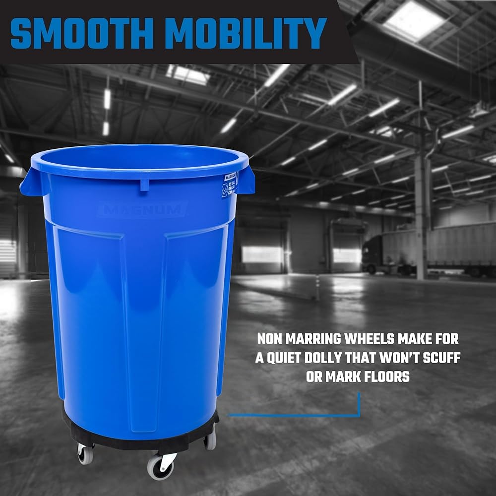 SMOOTH-ROLLING SUPER-QUIET WHEELS AND CASTERS: Unlike other trash can dollies, our trash can dolly with wheels boasts MAGNUM'S signature smooth nonmarring wheels and casters and make for a super quiet dolly that won't scuff or mark floors, ideal for hospitals, nursing homes, offices, schools, libraries, restaurants, or hotels, or maneuvering hallways, dusty roads, bumpy asphalt, and rough terrain