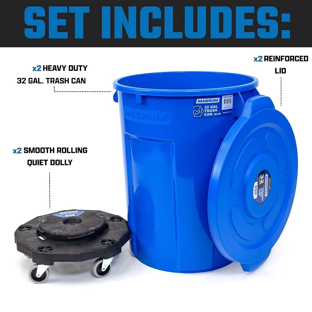 مجموعة سلة المهملات سعة 32 جالون من ماغنوم بلو (سلة المهملات، دوللي هادئة، وغطاء مقوى)، درجة البناء، موقع العمل جاهز للتعامل مع القمامة ولفها CMTC-CLD0-32B02 (مجموعتان)