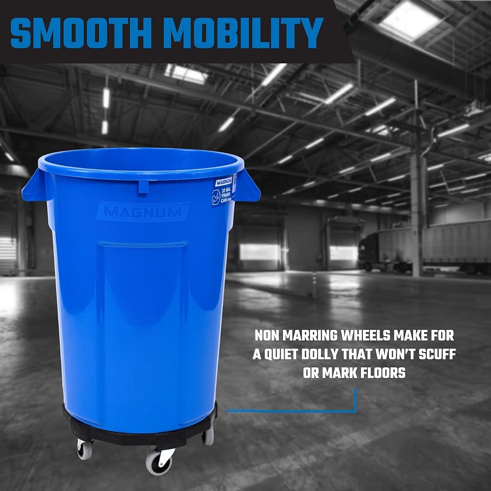 SMOOTH-ROLLING SUPER-QUIET WHEELS AND CASTERS: Unlike other trash can dollies, our trash can dolly with wheels boasts MAGNUM'S signature smooth nonmarring wheels and casters and make for a super quiet dolly that won't scuff or mark floors, ideal for hospitals, nursing homes, offices, schools, libraries, restaurants, or hotels, or maneuvering hallways, dusty roads, bumpy asphalt, and rough terrain