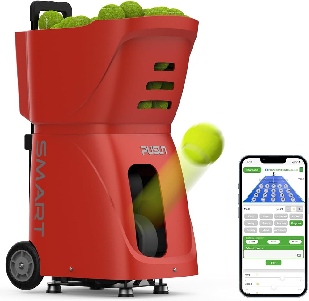 جهاز كرة التنس PT-SMART الذكي الذي يتم التحكم فيه من خلال تطبيق ذكي مع عمر بطارية يصل إلى 4-6 ساعات، وسرعة 120 كم/ساعة، وسعة الكرة أكثر من 100 و12 وضعًا للتدريب، ومدرب تنس محمول لممارسة التمارين في المنزل والملعب