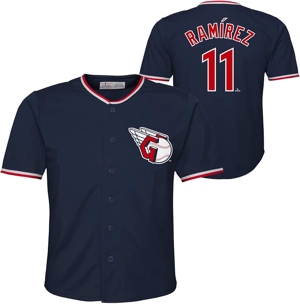 Jose Ramirez Cleveland Guardians #11 MLB Baseball Kids Youth 4-18 Navy Team Color Logo Baseball Player Fashion Jersey - Get your young Guardians fan game-day ready with the Jose Ramirez Cleveland Guardians #11 Kids Youth Fashion Jersey — the perfect blend of authentic team pride, comfort, and standout style. Designed in the team's bold Navy color, this jersey captures the spirit of the game and the excitement of cheering for one of Texas's brightest stars. This officially licensed MLB jersey features the iconic Guardians team logo where the heart lies, echoing the look of the on-field uniforms. On the back, Ramirez full name and jersey number are proudly displayed in large, high-quality screen-printed graphics, letting everyone know who their favorite player is. Constructed from 100% breathable polyester, this fashion jersey is lightweight, durable, and built for comfort — perfect for long days at the ballpark, school, or casual wear. Whether they're running the bases or watching from home, this jersey is designed to move with them. We offer a full range of youth sizes from 4 to 18 (X-Small 4/5, Small 6/7, Medium 8, Large 10/12, X-Large 14/16, and XX-Large 18), making it easy to find the perfect fit for every young Texas fan. Whether you're shopping for a birthday, holiday, or gearing up for the season, this jersey makes a fantastic gift and a must-have addition to any kid's Guardians wardrobe. Let them show their team spirit and rep Jose Ramirez in style with this sharp, comfortable, and officially licensed fashion jersey.