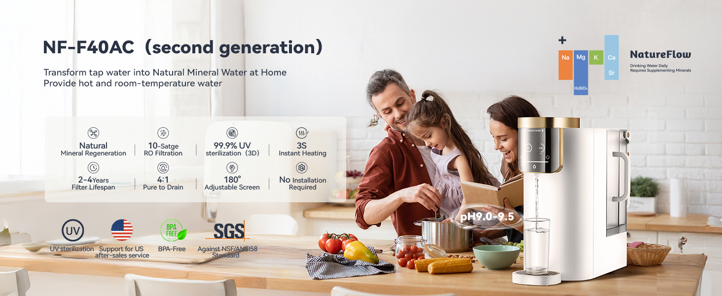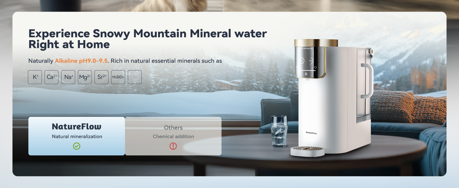 【تقنية التمعدن الصحي والطبيعي】 على عكس الأنظمة الأخرى التي تضيف مواد كيميائية إلى الماء، يستخدم NatureFlow عملية طبيعية 100% لاستعادة المعادن الأساسية مثل البوتاسيوم (K)، والكالسيوم (Ca)، والصوديوم (Na)، والمغنيسيوم (Mg)، والسترونتيوم (Sr)، وحمض الميتاسيليسيك (H₂SiO₂). ومن خلال محاكاة التكوين الطبيعي لمياه الينابيع، يقوم النظام بتنشيط المعادن المفيدة داخل الفلتر وإعادة إدخالها بنسبة مصممة بدقة. والنتيجة هي مياه معدنية قلوية ضعيفة (درجة الحموضة 9.0-9.5) التي تساعد على تحييد حموضة الجسم ودعم الصحة العامة.