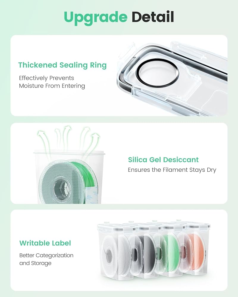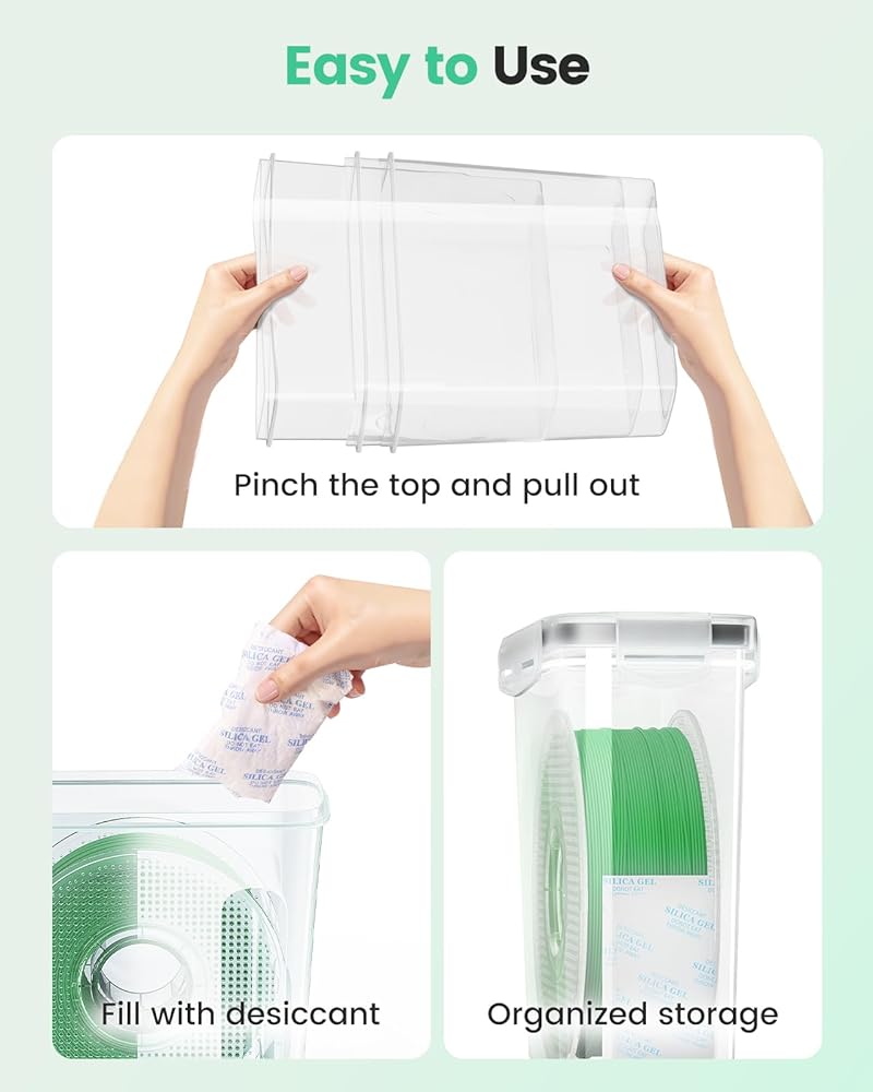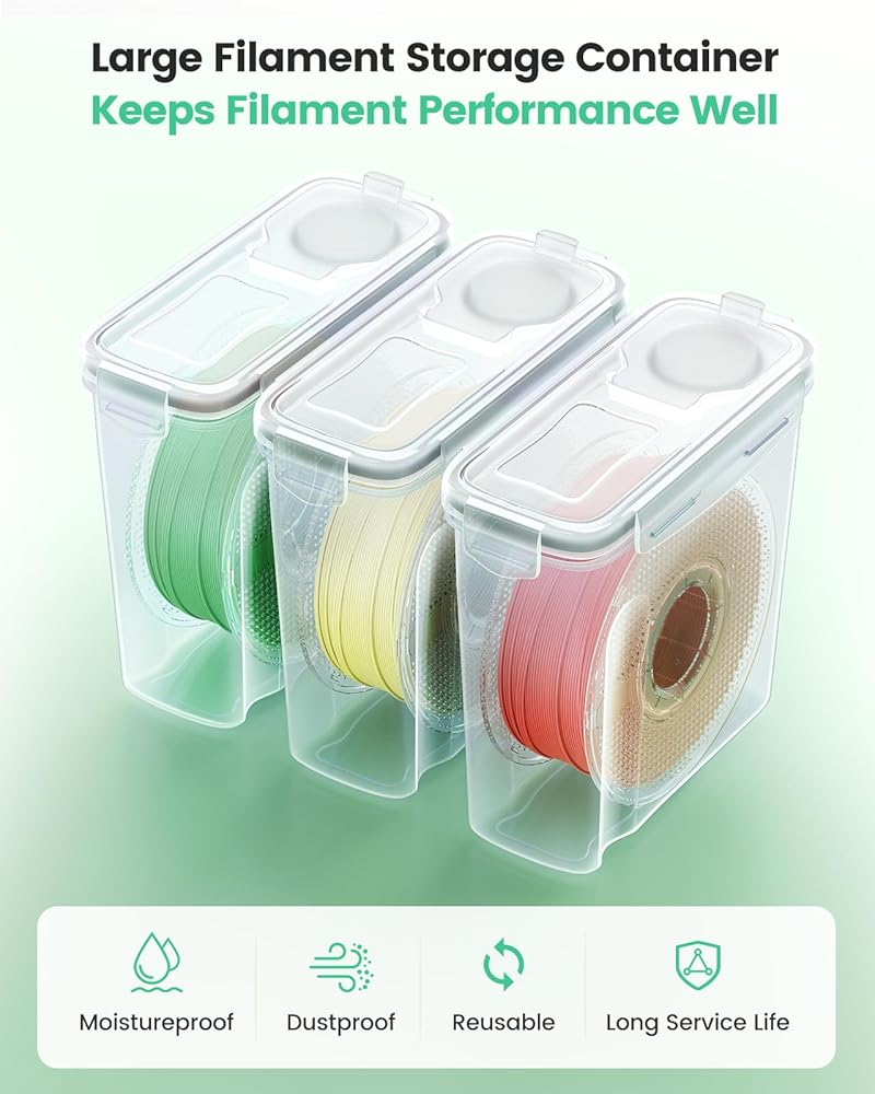Universal Compatibility: This 3d printer filament storage box is designed to fit nearly all standard 1.75mm filament spools on the market, making it the perfect choice for most 3D printing enthusiasts. Whether you use PLA, ABS, PETG, TPU, or other popular materials, this container securely holds 1KG spools with ease