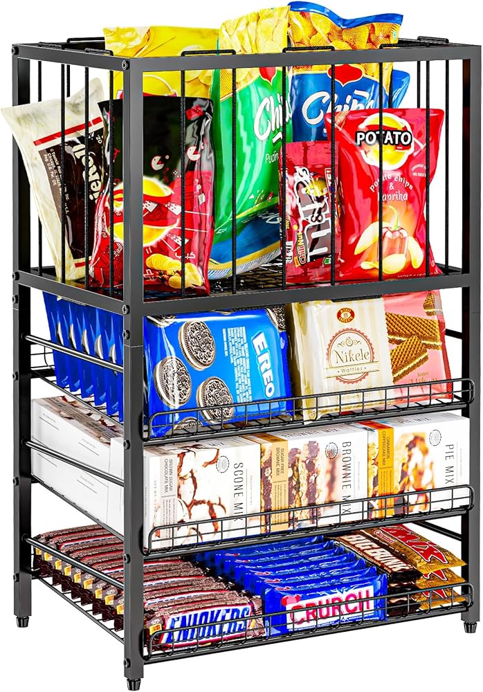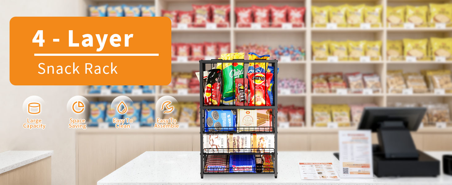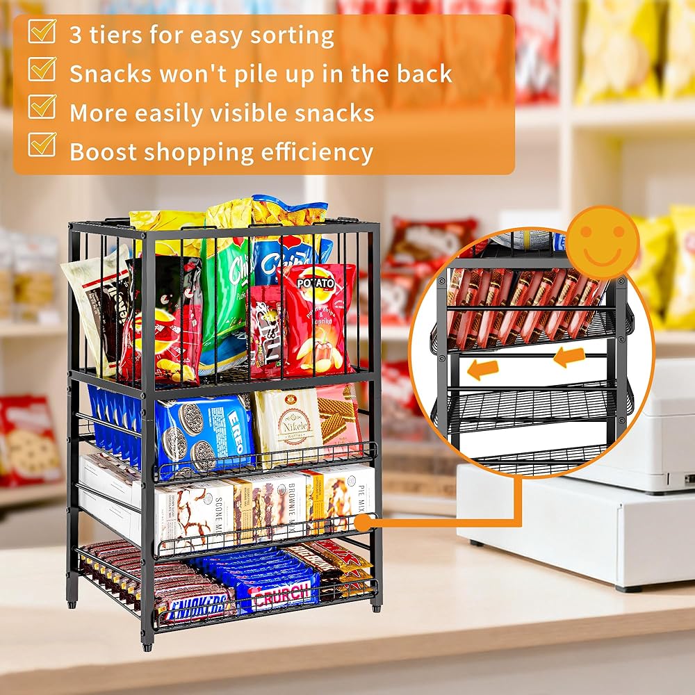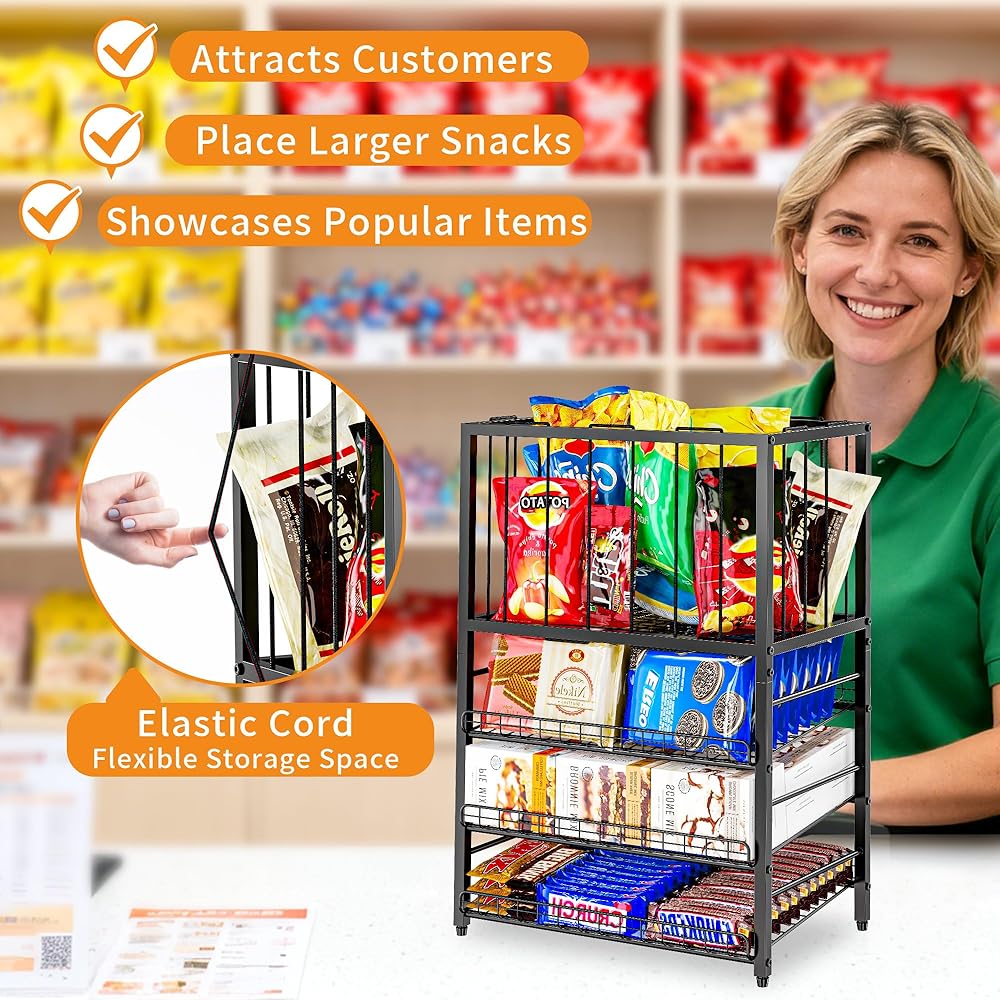 رف عرض الحلوى، منظم الوجبات الخفيفة من 4 طبقات للمنضدة، حامل حقيبة رقائق البطاطس مع إطار حبل مرن، محطة بار الوجبات الخفيفة، رف عرض البيع بالتجزئة للمتجر، حجرة المؤن، المكتب (أسود)