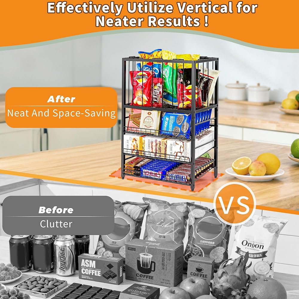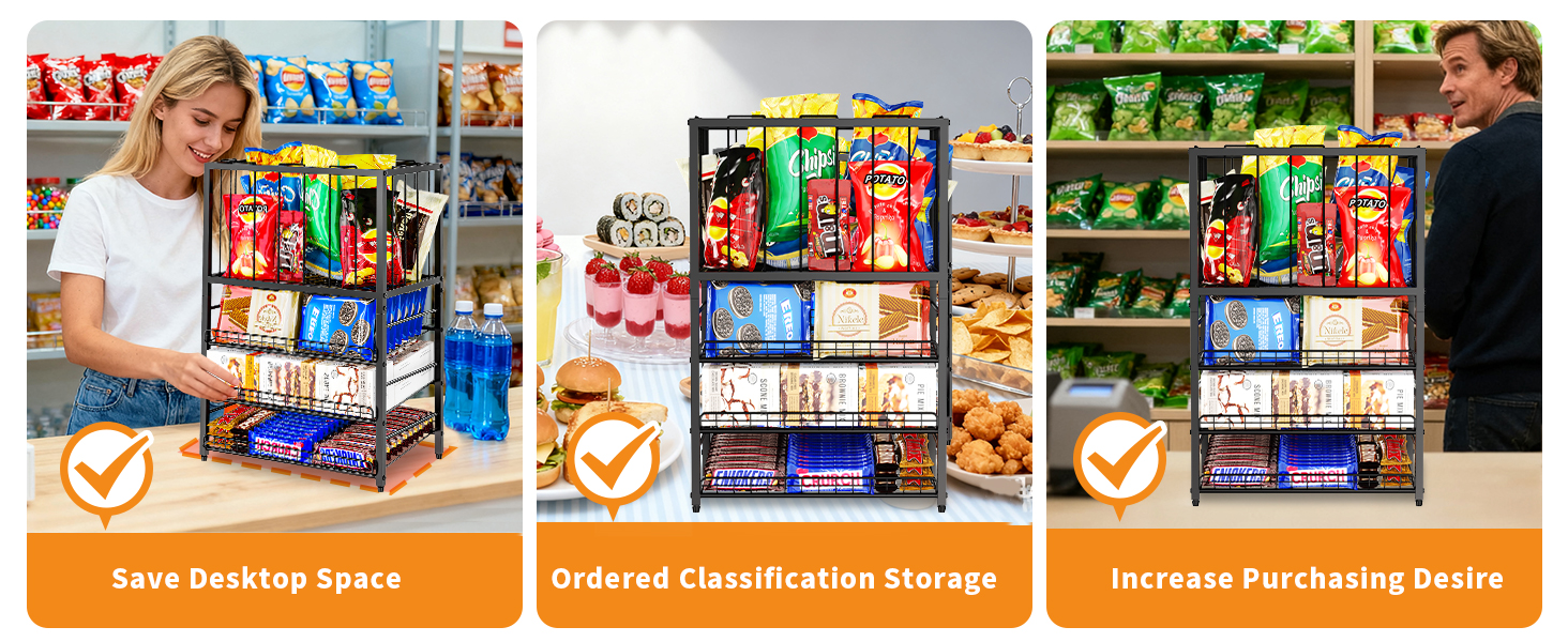 • 【موفر للمساحة، تصفح سريع】يعتمد منظم الرقائق لمخزن المؤن تصميمًا رأسيًا، مما يوفر مساحة سطح الطاولة بشكل فعال. يتم ترتيب السلال الشبكية ذات الثلاث طبقات في طبقات، مع ميل كل طبقة قليلاً، مما يمنع تراكم الوجبات الخفيفة في الخلف. ويساعد هذا التصميم العملاء على تصفح الوجبات الخفيفة بسرعة، مما يسمح لهم بتحديد موقع العناصر المطلوبة بسهولة وتعزيز تجربة التسوق وكفاءته.