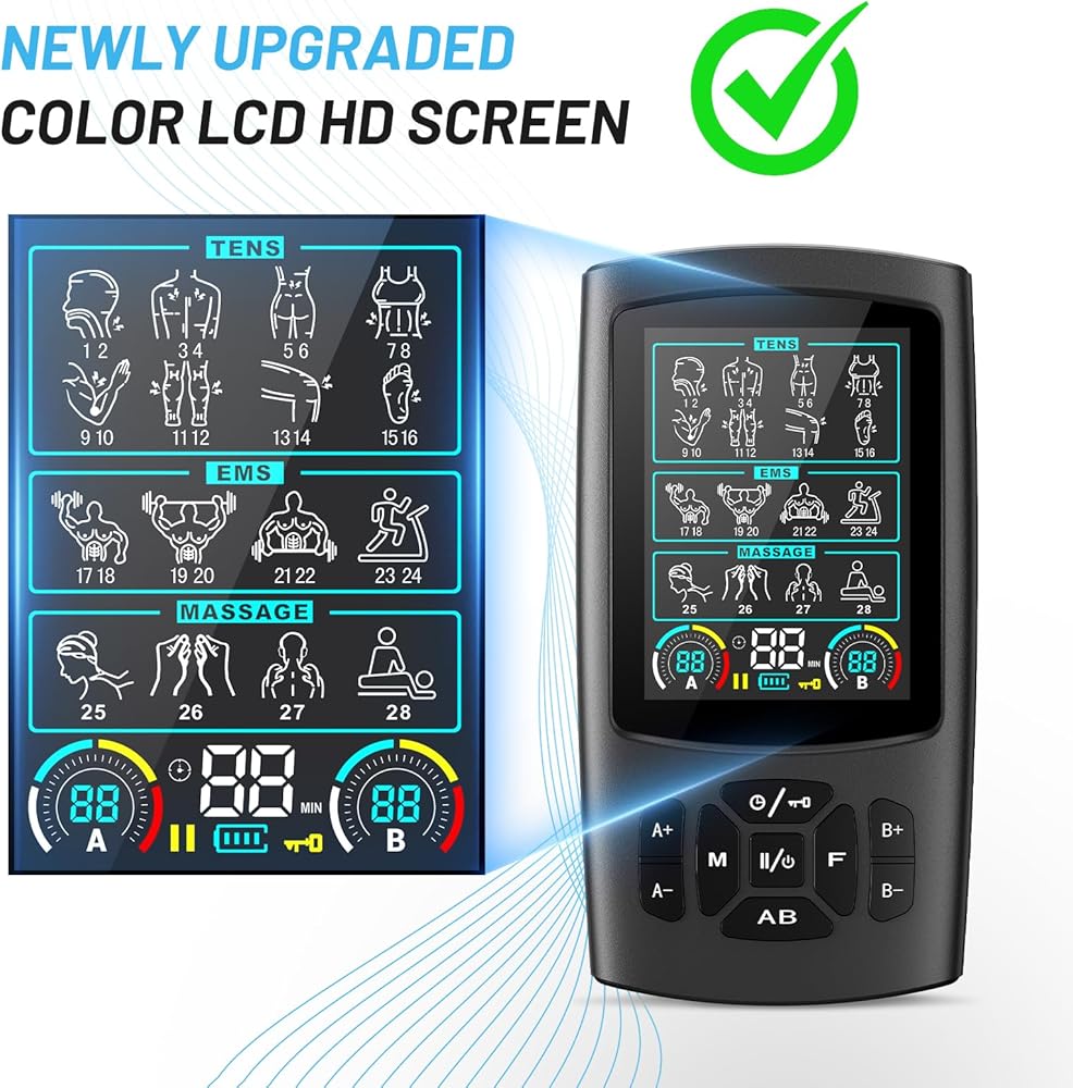 شاشة ملونة مقاس 3.8 بوصة - شاشة ملونة بديهية كبيرة تجعل التشغيل واضحًا على وحدة العشرات هذه لجهاز علاج آلام الظهر. عرض الأوضاع والتعديلات في لمحة. سواء كان رياضيًا أو كبيرًا أو عاملًا في المكتب، فإن محفز العضلات بوحدة TENS EMS يعمل على تبسيط روتين العافية الخاص بك. تعرض الشاشة بوضوح جميع إعدادات محفز العضلات للأقطاب الكهربائية.