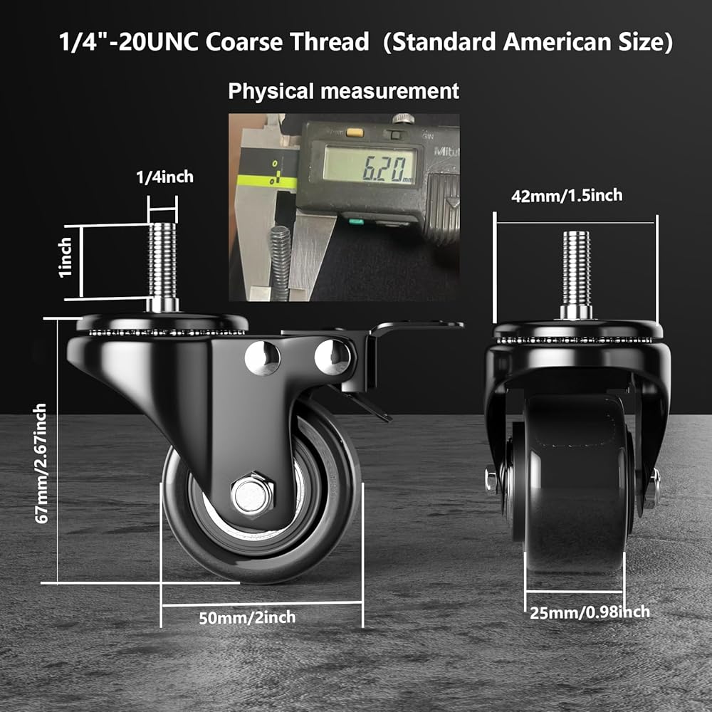 الحجم الأمريكي القياسي 1/4 بوصة -20UNC × 1 بوصة: قطر العجلات الملولبة: 1/4 بوصة، طول الجذع 1 بوصة، عجلات عجلات متينة ذات قفل مزدوج مع فرامل سهلة التركيب مع أدوات التثبيت المتضمنة، 4 صواميل، 4 غسالات و2 مفتاح ربط، يرجى التأكد من مواصفات المسمار المطلوبة قبل شراء عجلات العجلات الجذعية 2 بوصة.