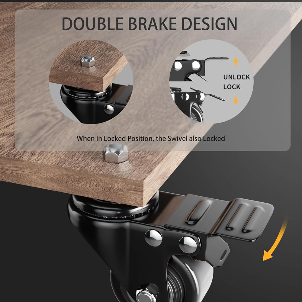 تصميم قفل مزدوج: تعمل هذه الفرامل على قفل العجلة والدوران في الوقت نفسه، مما يحافظ على المعدات بقوة في مكانها لتقليل الحوادث. تعتبر فرامل العجلات المركبة والقفل الدوار ضروريين للسلامة في بعض التطبيقات، مثل طاولات العمل، ومناشير الطاولة، والمعدات الطبية، وتستخدم على الأرضيات غير المستوية.