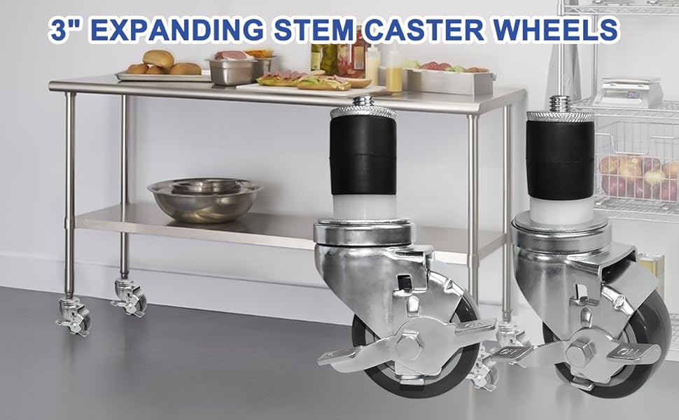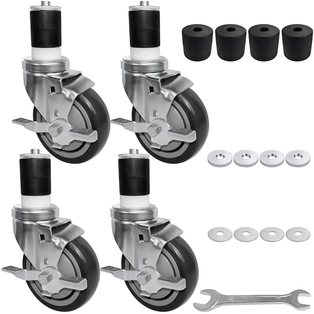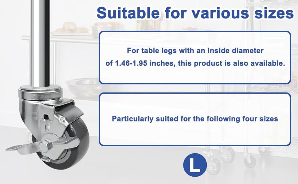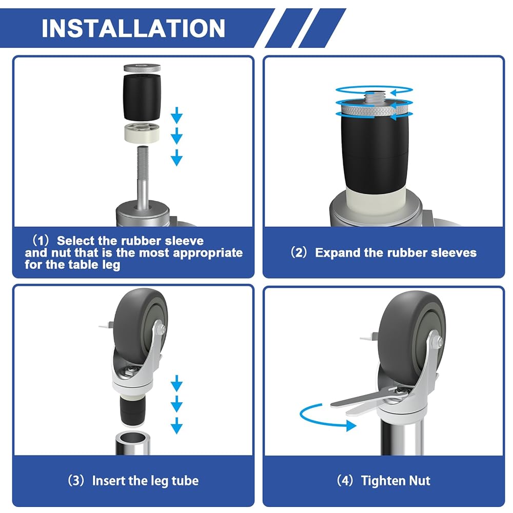 عجلات طاولة من الفولاذ المقاوم للصدأ سهلة التركيب: يرجى قياس القطر الداخلي لأرجل الطاولة قبل الطلب في حالة عدم ملاءمتها. مجموعة من 4 عجلات طاولة عمل تأتي مع 4 أكمام مطاطية مختلفة الحجم (1-1/2 بوصة، 1-5/8 بوصة، 1-3/4 بوصة، 1-7/8 بوصة) لطاولة المطبخ.