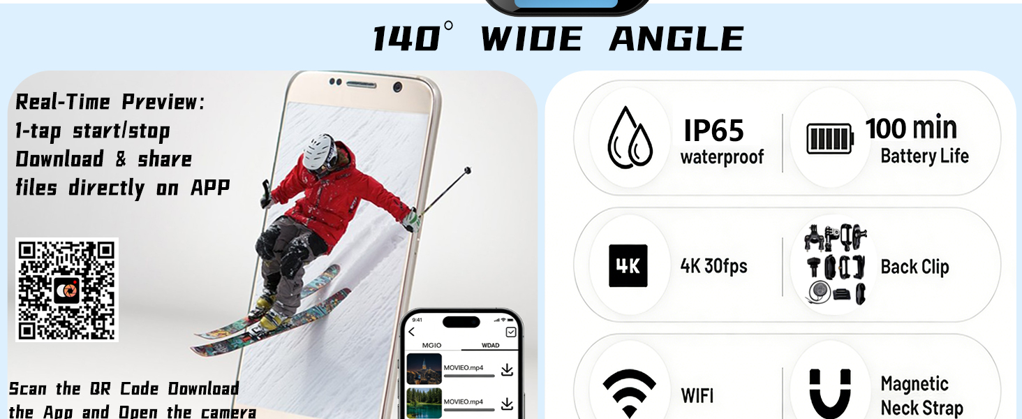 اتصال WiFi وتصميم بدون استخدام اليدين: معاينة ومشاركة على الفور عبر تطبيق WiFi مع تسجيل بلمسة واحدة. قم بالتسجيل أثناء الشحن / 100 دقيقة من الاستخدام المستمر عند الشحن الكامل. انقل الملفات لاسلكيًا. قاعدة مغناطيسية ومشابك وتركيب 360 درجة