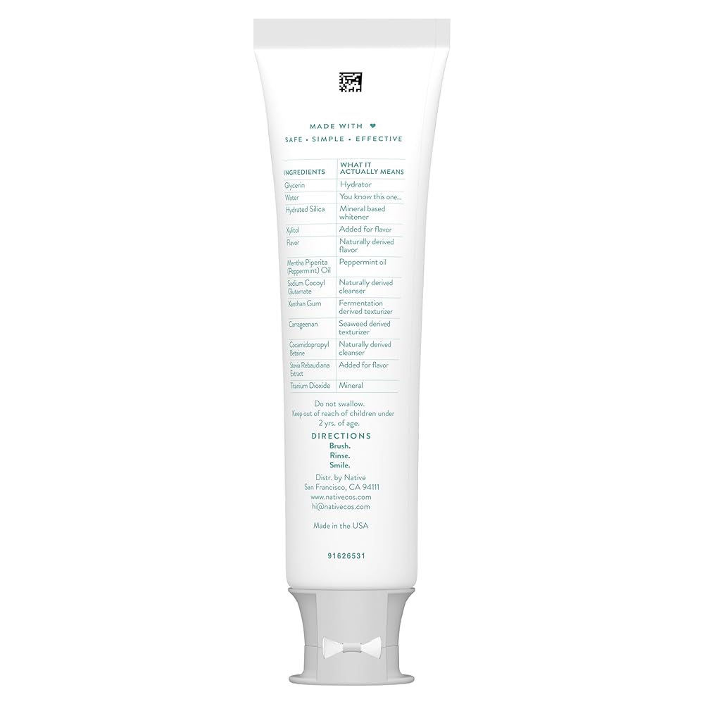 Brushing with Native Toothpaste gently whitens your teeth and freshens your breath, elevating your everyday routine. Thoughtfully crafted with only 12 ingredients, this formula ensures you get the best care for your smile while enjoying the fresh flavor of Wild Mint & Peppermint Oil. Free of fluoride, SLS, parabens, artificial sweeteners, artificial flavors, triclosan, or gluten. Plus, it's never tested on animals—only on humans who volunteer. Native: Clean. Simple. Effective. Experience a delightful oral care routine that truly delivers.