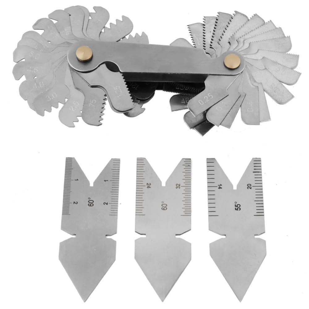 This precision thread pitch gauge set is engineered for accurate measurement of screw threads and tool alignment. Constructed with stainless steel, these gauges provide long-lasting performance and clear markings for effortless reading. The set includes a comprehensive pitch gauge with both metric and imperial ranges, plus specialized center gauges for precise tool grinding.