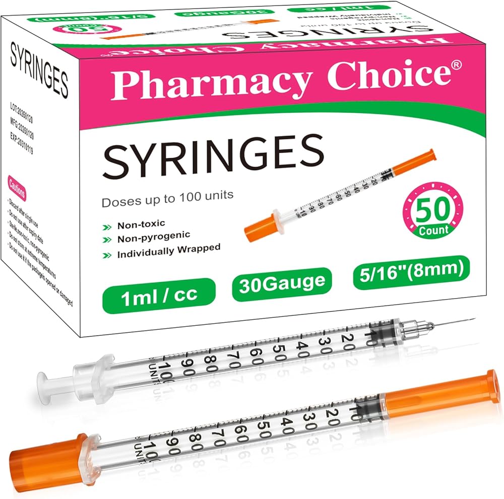 حقنة 1 مل 30 قياس 5/16 بوصة 8 مم، معبأة بشكل فردي، 50 عبوة