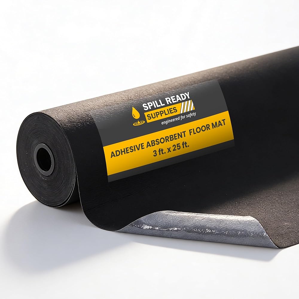 The Spill Ready 3' x 100' adhesive absorbent grippy floor mat is built for indoor facilities that need dependable daily spill and drip control without complicated setup. This heavyweight adhesive absorbent floor mat combines a grippy backing with a low-profile 3 mm absorbent surface to help manage oil, grease and water in active work zones. Because the mat stays flatter and more secure, it supports cleaner walkways, machine areas, service counters, maintenance aisles and workstation zones where routine leaks or tracked-in moisture can create mess and downtime. The cut-to-fit format makes it easy to size the mat for concrete, tile, vinyl, laminate and linoleum floors, while the black industrial finish presents a clean, professional appearance. Use this sticky floor mat as a practical industrial floor runner for targeted floor protection, faster cleanup and improved housekeeping in warehouses, workshops, retail back rooms and commercial facilities.