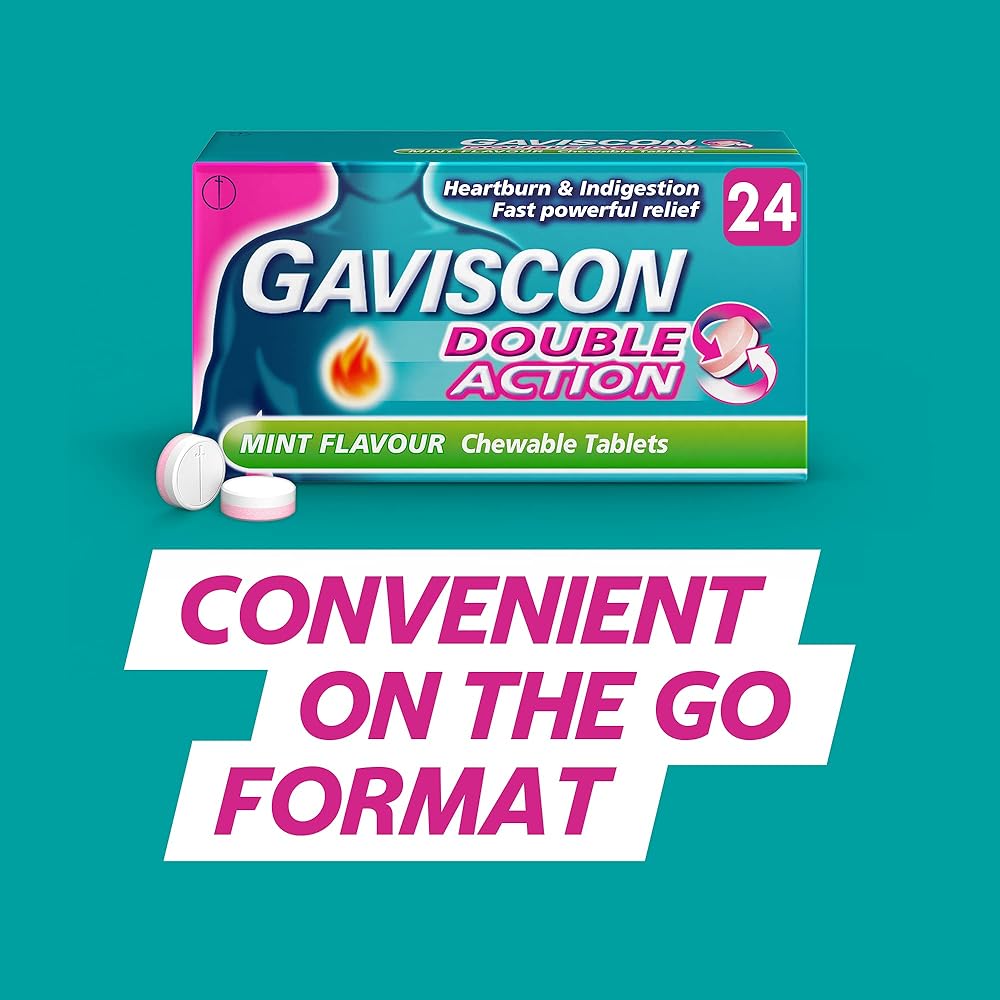 Gaviscon Double Action Mint Tablets bring fast, soothing and long lasting relief for up to 4 hours from heartburn and indigestion. They get to work in two different ways: